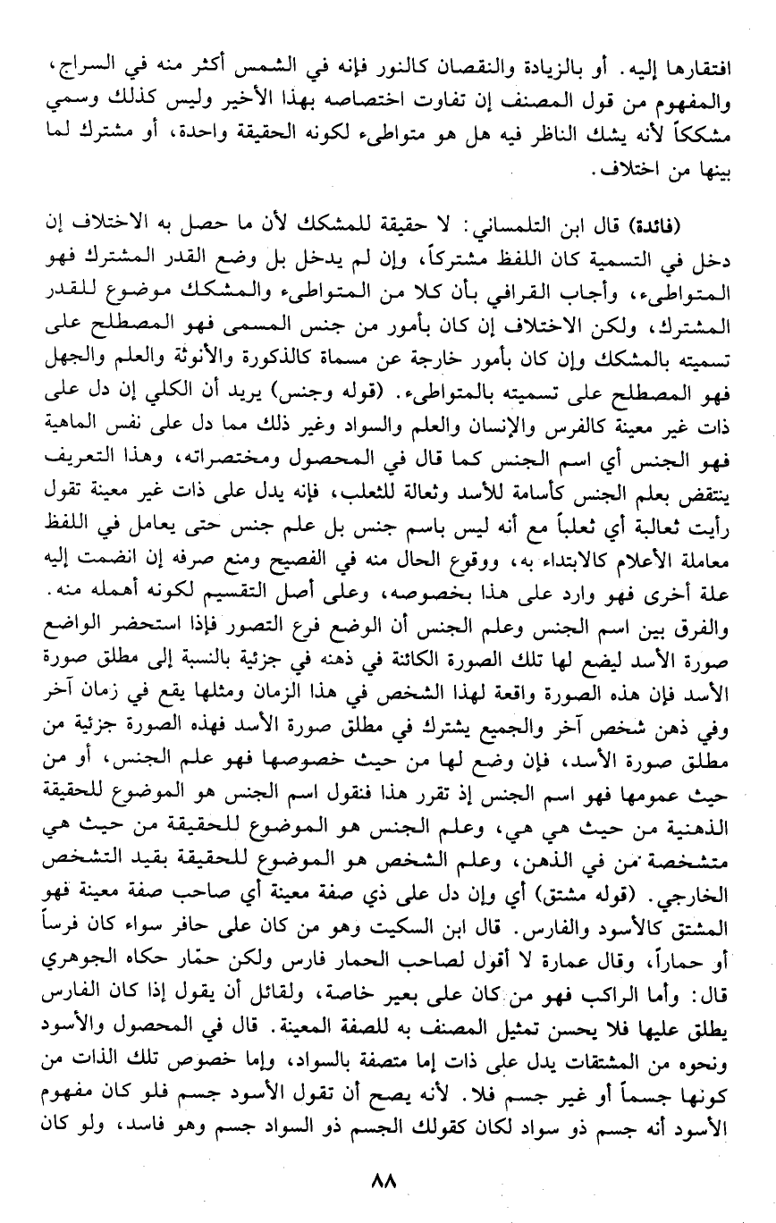 "فائدة": قال ابن التلمساني: لا حقيقة للمشكك؛ لأن ما حصل به الاختلاف إن دخل في التسمية كان اللفظ مشتركا، وإن لم يدخل بل وضع القدر المشترك فهو المتواطئ, وأجاب القرافي بأن كلا من المتواطئ والمشكك موضوع للقدر المشترك، ولكن الاختلاف إن كان بأمور من جنس المسمى فهو المصطلح على تسميته بالمشكك، وإن كان بأمور خارجة عن مسماه كالذكورة والأنوثة والعلم والجهل فهو المصطلح على تسميته بالمتواطئ. قوله: "وجنس" يريد: أن الكلي إن دل على ذات غير معينة كالفرس والإنسان والعلم والسواد وغير ذلك مما دل على نفس الماهية, فهو الجنس أي: اسم الجنس كما قال في المحصول ومختصراته، وهذا التعريف ينتقض بعلم الجنس كأسامة للأسد وثعالة للثعلب، فإنه يدل على ذات غير معينة تقول: رأيت ثعالبة أي: ثعلبا مع أنه ليس باسم جنس بل علم جنس حتى يعامل في اللفظ معاملة الأعلام كالابتداء به، ووقوع الحال منه في الفصيح ومنع صرفه إن انضمت إليه علة أخرى, فهو وارد على هذا بخصوصه، وعلى أصل التقسيم لكونه أهمله منه. والفرق بين اسم الجنس وعلم الجنس أن الوضع فرع التصور فإذا استحضر الواضع صورة الأسد ليضع لها تلك الصورة الكائنة في ذهنه في جزئية بالنسبة إلى مطلق صورة الأسد, فإن هذه الصورة واقعة لهذا الشخص في هذا الزمان, ومثلها يقع في زمان آخر وفي ذهن شخص آخر والجميع يشترك في مطلق صورة الأسد, فهذه الصورة جزئية من مطلق صورة الأسد، فإن وضع لها من حيث خصوصها فهو علم الجنس، أو من حيث عمومها فهو اسم الجنس, إذا تقرر هذا فنقول: اسم الجنس هو الموضوع للحقيقة الذهنية من حيث هي هي، وعلم الجنس هو الموضوع للحقيقة من حيث هي متشخصة من في الذهن، وعلم الشخص هو الموضوع للحقيقة بقيد التشخص الخارجي. قوله: "مشتق" أي: وإن دل على ذي صفة معينة أي: صاحب صفة معينة, فهو المشتق كالأسود والفارس. قال ابن السكيت: وهو من كان على حافر سواء كان فرسا أو حمارا، وقال عمارة: لا أقول لصاحب الحمار: فارس ولكن حمّار, حكاه الجوهري قال: وأما الراكب فهو من كان على بعير خاصة، ولقائل أن يقول: إذا كان الفارس يطلق عليها فلا يحسن تمثيل المصنف به للصفة المعينة. قال في المحصول: والأسود ونحوه من المشتقات يدل على ذات إما متصفة بالسواد، وإما خصوص تلك الذات من كونها جسما أو غير جسم فلا؛ لأنه يصح أن تقول: الأسود جسم, فلو كان مفهوم الأسود أنه جسم ذو سواد, لكان كقولك: الجسم ذو السواد جسم وهو فاسد، ولو كان