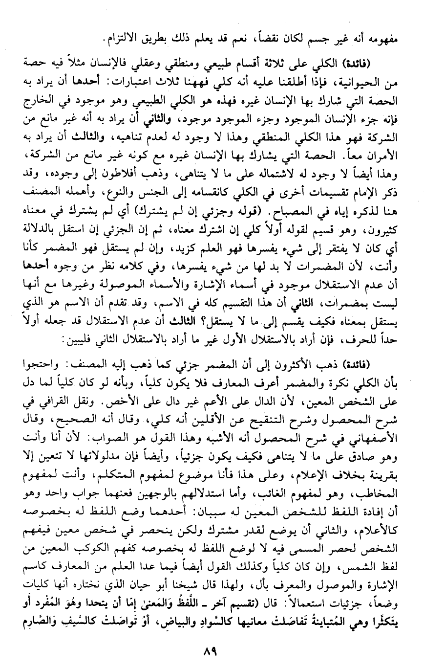 "فائدة": الكلي على ثلاثة أقسام: طبيعي ومنطقي وعقلي؛ فالإنسان مثلا فيه حصة من الحيوانية, فإذا أطلقنا عليه أنه كلي فههنا ثلاثة اعتبارات, أحدها: أن يراد به الحصة التي شارك بها الإنسان غيره, فهذا هو الكلي الطبيعي وهو موجود في الخارج فإنه جزء الإنسان الموجود وجزء الموجود موجود، والثاني: أن يرد به أنه غير مانع من الشركة فهو هذا الكلي المنطقي, وهذا لا وجود له لعدم تناهيه، والثالث: أن يراد به الأمران معا, الحصة التي يشارك بها الإنسان غيره مع كونه غير مانع من الشركة، وهذا أيضا لا وجود له لاشتماله على ما لا يتناهى، وذهب أفلاطون إلى وجوده، وقد ذكر الإمام تقسيمات أخرى في الكلي كانقسامه إلى: الجنس والنوع، وأهمله المصنف هنا لذكره إياه في المصباح. قوله: "وجزئي, إن لم يشترك" أي: لم يشترك في معناه كثيرون، وهو قسيم لقوله: أولا كلي, إن اشترك معناه، ثم إن الجزئي إن استقل بالدلالة أي: كان لا يفتقر إلى شيء يفسرها فهو العلم كزيد، وإن لم يستقل فهو المضمر كأنا وأنت؛ لأن المضمرات لا بد لها من شيء يفسرها، وفي كلامه نظر من وجوه أحدها: أن عدم الاستقلال موجود في أسماء الإشارة والأسماء الموصولة وغيرها مع أنها ليست بمضمرات، الثاني: أن هذا التقسيم كله في الاسم، وقد تقدم أن الاسم هو الذي يستقل بمعناه, فكيف يقسم إلى ما لا يستقل؟ الثالث: أن عدم الاستقلال قد جعله أولا حدّا للحرف، فإن أراد بالاستقلال الأول غير ما أراد بالاستقلال الثاني فليبين.