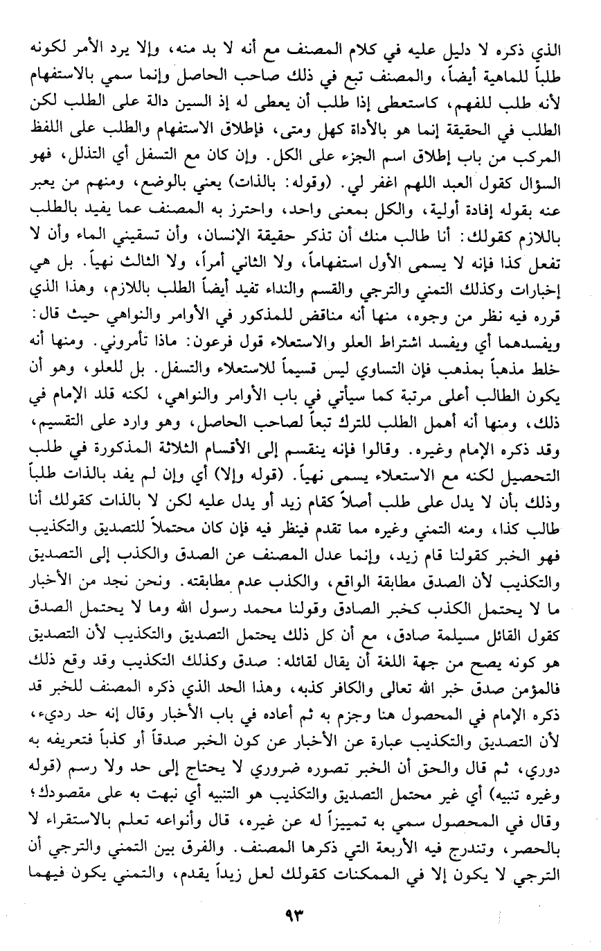الذي ذكره لا دليل عليه في كلام المصنف مع أنه لا بد منه، وإلا يرد الأمر لكونه طلبا للماهية أيضا، والمصنف تبع في ذلك صاحب الحاصل وإنما سمي بالاستفهام؛ لأنه طلب للفهم، كاستعطى إذا طلب أن يعطى له إذ السين دالة على الطلب لكن الطلب في الحقيقة إنما هو بالأداة كهل ومتى، فإطلاق الاستفهام والطلب على اللفظ المركب من باب إطلاق اسم الجزء على الكل. وإن كان مع التسفل أي التذلل، فهو السؤال كقول العبد: اللهم اغفر لي. وقوله: "بالذات" يعني بالوضع، ومنهم من يعبر عنه بقوله: إفادة أولية, والكل بمعنى واحد, واحترز به المصنف عما يفيد بالطلب باللازم كقولك: أنا طالب منك أن تذكر حقيقة الإنسان، وأن تسقيني الماء، وأن لا تفعل كذا, فإنه لا يسمى الأول استفهاما، ولا الثاني أمرا, لا الثالث نهيا, بل هي إخبارات وكذلك التمني والترجي والقسم والنداء تفيد أيضا الطلب باللازم، وهذا الذي قرره فيه نظر من وجوه، منها أنه مناقض للمذكور في الأوامر والنواهي حيث قال: ويفسدهما أي: ويفسد اشتراط العلو والاستعلاء قول فرعون: ماذا تأمرونني؟ ومنها أنه خلط مذهبا بمذهب, فإن التساوي ليس قسيما للاستعلاء والتسفل بل للعلو، وهو أن يكون الطالب أعلى مرتبة كما سيأتي في باب الأوامر والنواهي، لكنه قلد الإمام في ذلك، ومنها أنه أهمل الطلب للترك تبعا لصاحب الحاصل, وهو وارد على التقسيم، وقد ذكره الإمام وغيره. وقالوا: فإنه ينقسم إلى الأقسام الثلاثة المذكورة في طلب التحصيل, لكنه مع الاستعلاء يسمى نهيا. قوله: "وإلا" أي: وإن لم يفد بالذات طلبا, وذلك بأن لا يدل على طلب أصلا كقام زيد أو يدل عليه لكن لا بالذات كقولك: أنا طالب كذا، ومنه التمني وغيره مما تقدم فينظر فيه, فإن كان محتملا للتصديق والتكذيب فهو الخبر كقولنا: قام زيد، وإنما عدل المصنف عن الصدق والكذب إلى التصديق والتكذيب؛ لأن الصدق مطابقة الواقع، والكذب عدم مطابقته. ونحن نجد من الأخبار ما لا يحتمل الكذب كخبر الصادق وقولنا: محمد رسول الله وما لا يحتمل الصدق كقول القائل: مسيلمة صادق، مع أن كل ذلك يحتمل التصديق والتكذيب؛ لأن التصديق هو كونه يصح من جهة اللغة أن يقال لقائله: صدق, وكذلك التكذيب وقد وقع ذلك فالمؤمن صدق خبر الله تعالى والكافر كذبه، وهذا الحد الذي ذكره المصنف للخبر قد ذكره الإمام في المحصول هنا وجزم به ثم أعاده في باب الأخبار وقال: إنه حد رديء؛ لأن التصديق والتكذيب عبارة عن الأخبار عن كون الخبر صدقا أو كذبا فتعريفه به دوري، ثم قال: والحق أن الخبر تصوره ضروري لا يحتاج إلى حد ولا رسم. قوله: "وغيره تنبيه" أي: غير محتمل التصديق والتكذيب هو التنبيه أي: نبهت به على مقصودك؛ وقال في المحصول: سمي به تمييزا له عن غيره، قال: وأنواعه تعلم بالاستقراء لا بالحصر، وتندرج فيه الأربعة التي ذكرها المصنف, والفرق بين التمني والترجي أن الترجي لا يكون إلا في الممكنات كقولك: لعل زيدا يقدم، والتمني يكون فيهما كقولك: ليت الشباب يعود. واعلم أن قولنا: أنا طالب كذا لم يصرح المصنف بكونه داخلا في قسم الخبر أو التنبيه, وفيه نظر.