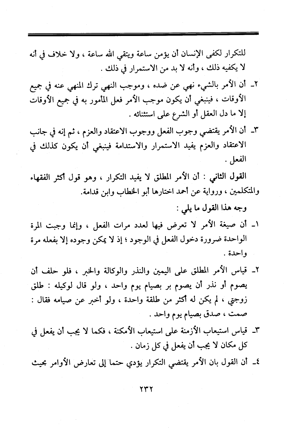 القول الثاني: أن الأمر المطلق لا يفيد التكرار، وهو قول أكثر الفقهاء والمتكلمين، ورواية عن أحمد اختارها أبو الخطاب وابن قدامة.