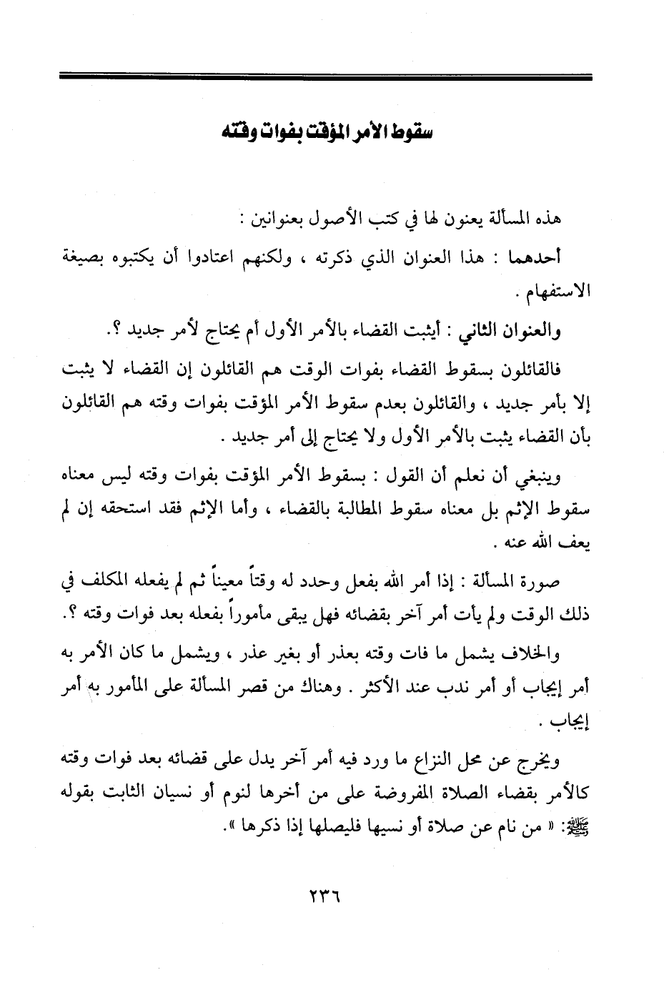وينبغي أن نعلم أن القول: بسقوط الأمر المؤقت بفوات وقته ليس معناه سقوط الإثم بل معناه سقوط المطالبة بالقضاء، وأما الإثم فقد استحقه إن لم يعف الله عنه.