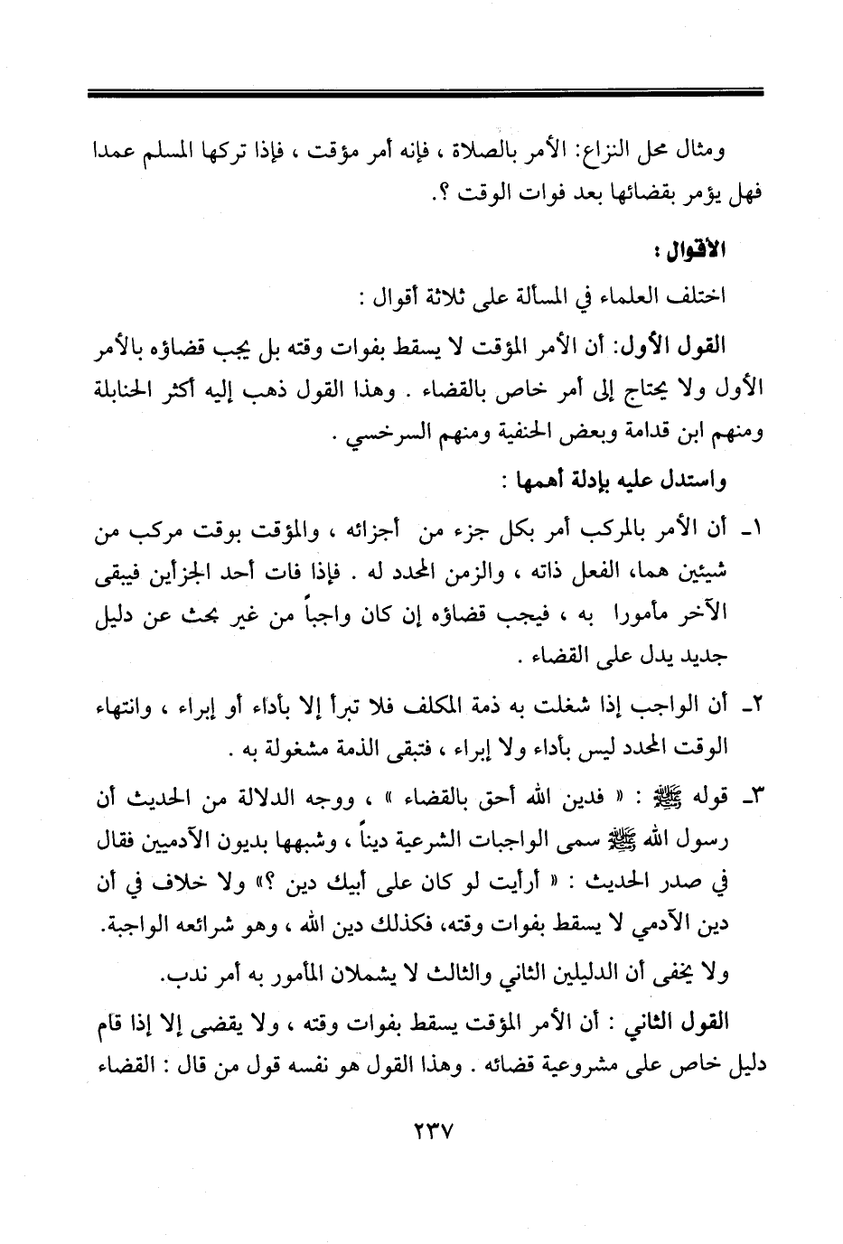 القول الأول: أن الأمر المؤقت لا يسقط بفوات وقته بل يجب قضاؤه بالأمر الأول ولا يحتاج إلى أمر خاص بالقضاء. وهذا القول ذهب إليه أكثر الحنابلة ومنهم ابن قدامة وبعض الحنفية ومنهم السرخسي.