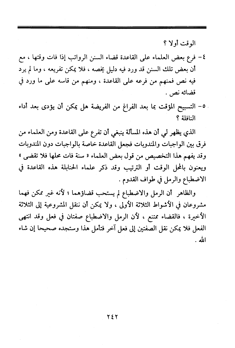 الذي يظهر لي أن هذه المسألة ينبغي أن تفرع على القاعدة ومن العلماء من فرق بين الواجبات والمندوبات فجعل القاعدة خاصة بالواجبات دون المندوبات وقد يفهم هذا التخصيص من قول بعض العلماء «سنة فات محلها فلا تقضى» ويعنون بالمحل الوقت أو الترتيب، وقد ذكر علماء الحنابلة هذه القاعدة في الرمل في طواف القدوم.