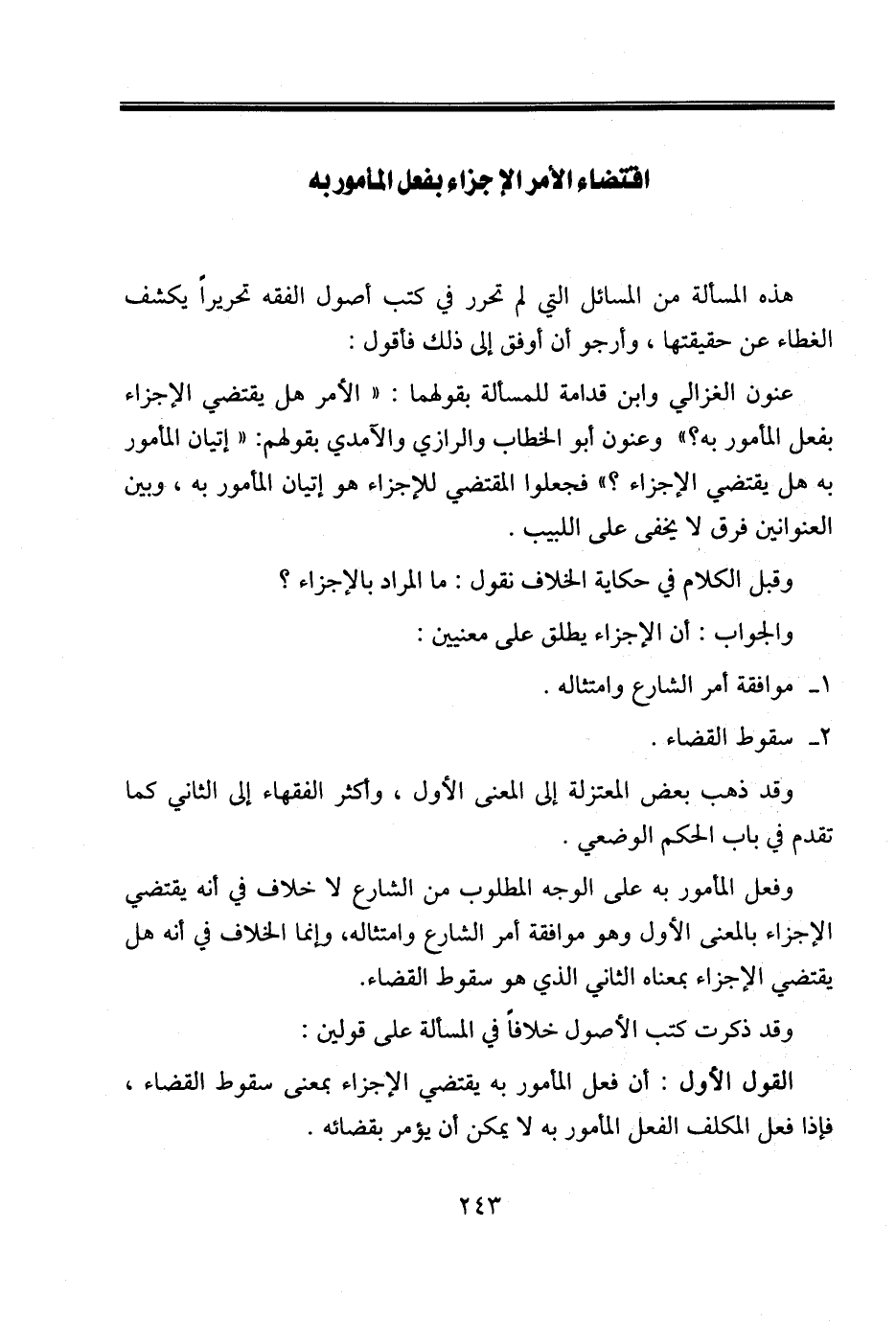 عنون الغزالي وابن قدامة للمسألة بقولهما: «الأمر هل يقتضي الإجزاء بفعل المأمور به؟» وعنون أبو الخطاب والرازي والآمدي بقولهم: «إتيان المأمور به هل يقتضي الإجزاء؟» فجعلوا المقتضي للإجزاء هو إتيان المأمور به، وبين العنوانين فرق لا يخفى على اللبيب.