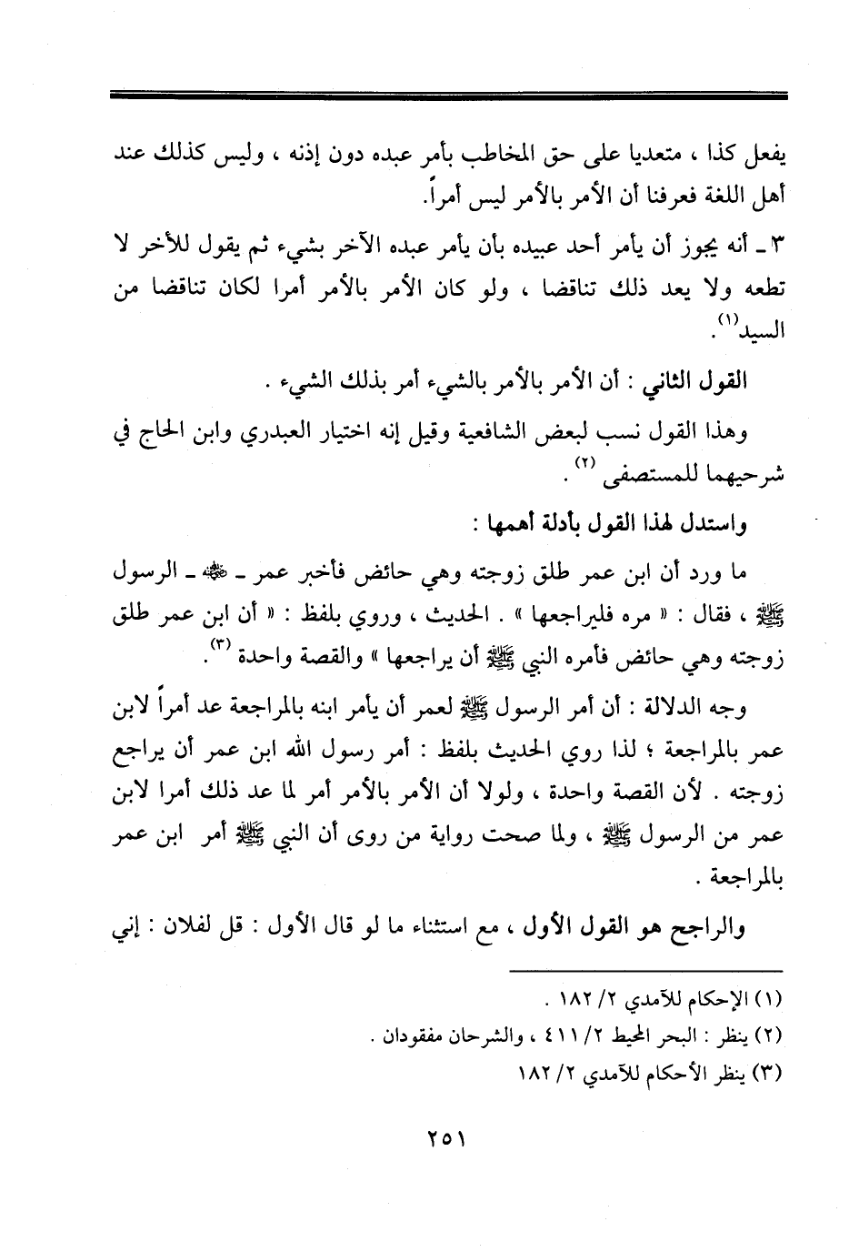وجه الدلالة: أن أمر الرسول صلى الله عليه وسلم لعمر أن يأمر ابنه بالمراجعة عد أمراً لابن عمر بالمراجعة؛ لذا روي الحديث بلفظ: أمر رسول الله ابن عمر أن يراجع زوجته. لأن القصة واحدة، ولولا أن الأمر بالأمر أمر لما عد ذلك أمرا لابن عمر من الرسول صلى الله عليه وسلم، ولما صحت رواية من روى أن النبي صلى الله عليه وسلم أمر ابن عمر بالمراجعة.