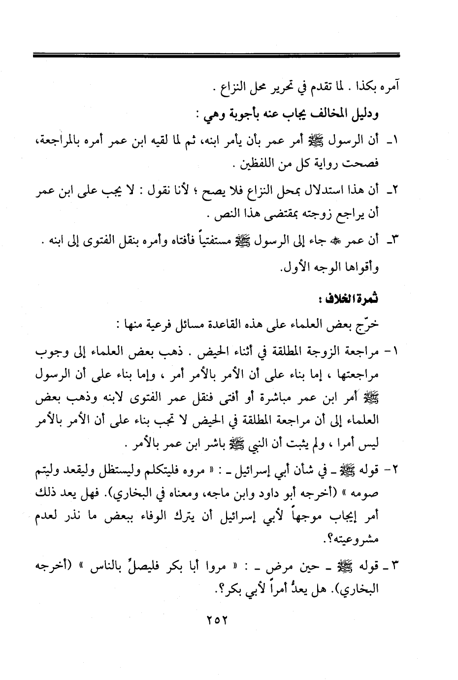 ١ - مراجعة الزوجة المطلقة في أثناء الحيض. ذهب بعض العلماء إلى وجوب مراجعتها، إما بناء على أن الأمر بالأمر أمر، وإما بناء على أن الرسول صلى الله عليه وسلم أمر ابن عمر مباشرة أو أفتى فنقل عمر الفتوى لابنه وذهب بعض العلماء إلى أن مراجعة المطلقة في الحيض لا تجب بناء على أن الأمر بالأمر ليس أمرا، ولم يثبت أن النبي صلى الله عليه وسلم باشر ابن عمر بالأمر.