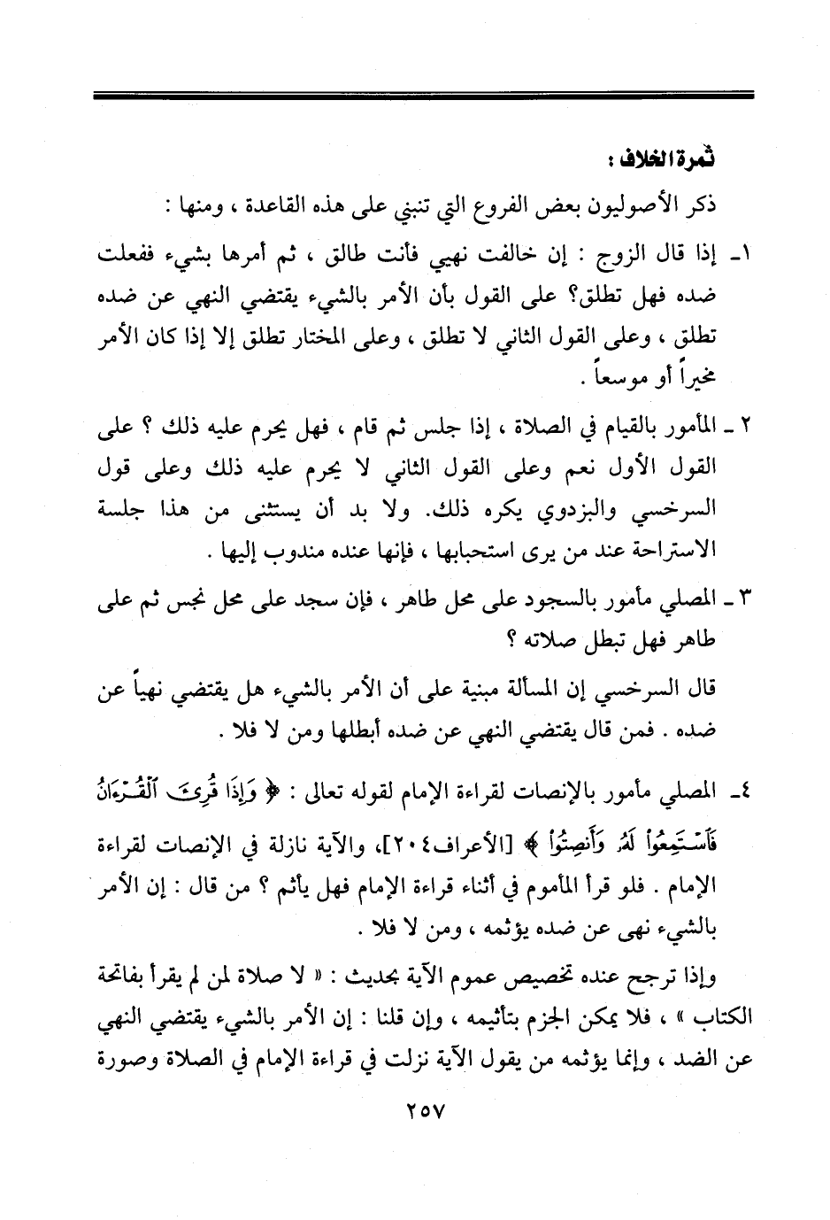 ٤ - المصلي مأمور بالإنصات لقراءة الإمام لقوله تعالى: {وَإِذَا قُرِئَ الْقُرْآنُ فَاسْتَمِعُوا لَهُ وَأَنْصِتُوا} [الأعراف٢٠٤]، والآية نازلة في الإنصات لقراءة الإمام. فلو قرأ المأموم في أثناء قراءة الإمام فهل يأثم؟ من قال: إن الأمر بالشيء نهى عن ضده يؤثمه، ومن لا فلا.