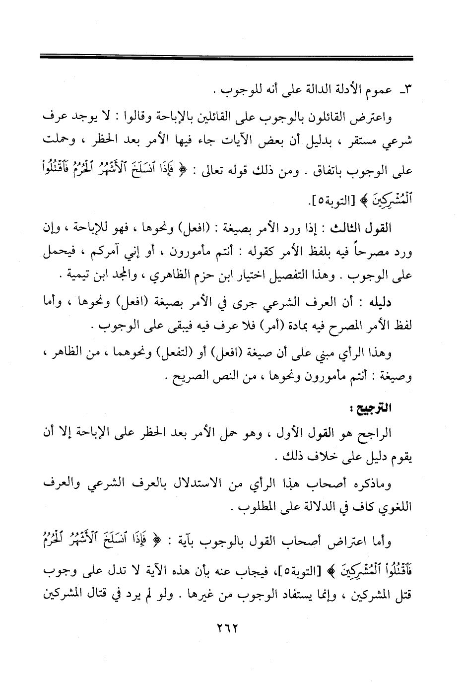 واعترض القائلون بالوجوب على القائلين بالإباحة وقالوا: لا يوجد عرف شرعي مستقر، بدليل أن بعض الآيات جاء فيها الأمر بعد الحظر، وحملت على الوجوب باتفاق. ومن ذلك قوله تعالى: {فَإِذَا انْسَلَخَ الْأَشْهُرُ الْحُرُمُ فَاقْتُلُوا الْمُشْرِكِينَ} [التوبة٥].