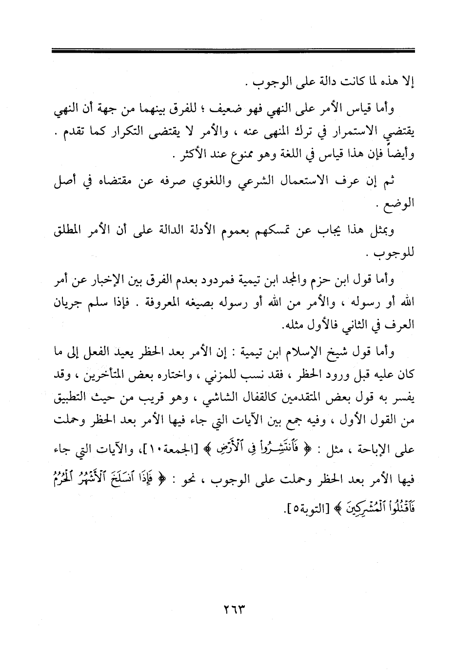 وأما قول شيخ الإسلام ابن تيمية: إن الأمر بعد الحظر يعيد الفعل إلى ما كان عليه قبل ورود الحظر، فقد نسب للمزني، واختاره بعض المتأخرين، وقد يفسر به قول بعض المتقدمين كالقفال الشاشي، وهو قريب من حيث التطبيق من القول الأول، وفيه جمع بين الآيات التي جاء فيها الأمر بعد الحظر وحملت على الإباحة، مثل: {فَانْتَشِرُوا فِي الْأَرْضِ} [الجمعة١٠]، والآيات التي جاء فيها الأمر بعد الحظر وحملت على الوجوب، نحو: {فَإِذَا انْسَلَخَ الْأَشْهُرُ الْحُرُمُ فَاقْتُلُوا الْمُشْرِكِينَ} [التوبة٥].