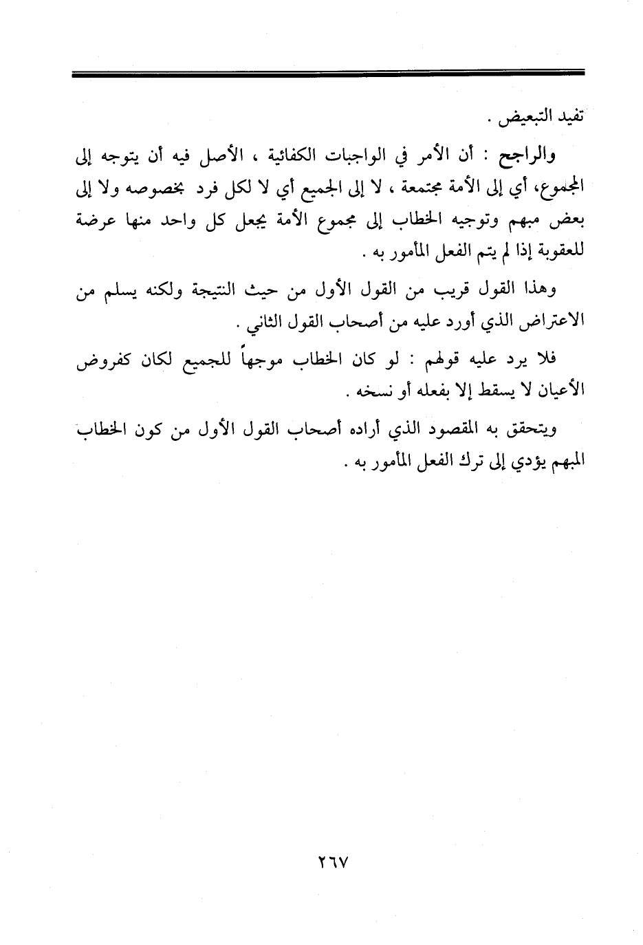 والراجح: أن الأمر في الواجبات الكفائية، الأصل فيه أن يتوجه إلى المجموع، أي إلى الأمة مجتمعة، لا إلى الجميع أي لا لكل فرد بخصوصه ولا إلى بعض مبهم وتوجيه الخطاب إلى مجموع الأمة يجعل كل واحد منها عرضة للعقوبة إذا لم يتم الفعل المأمور به.