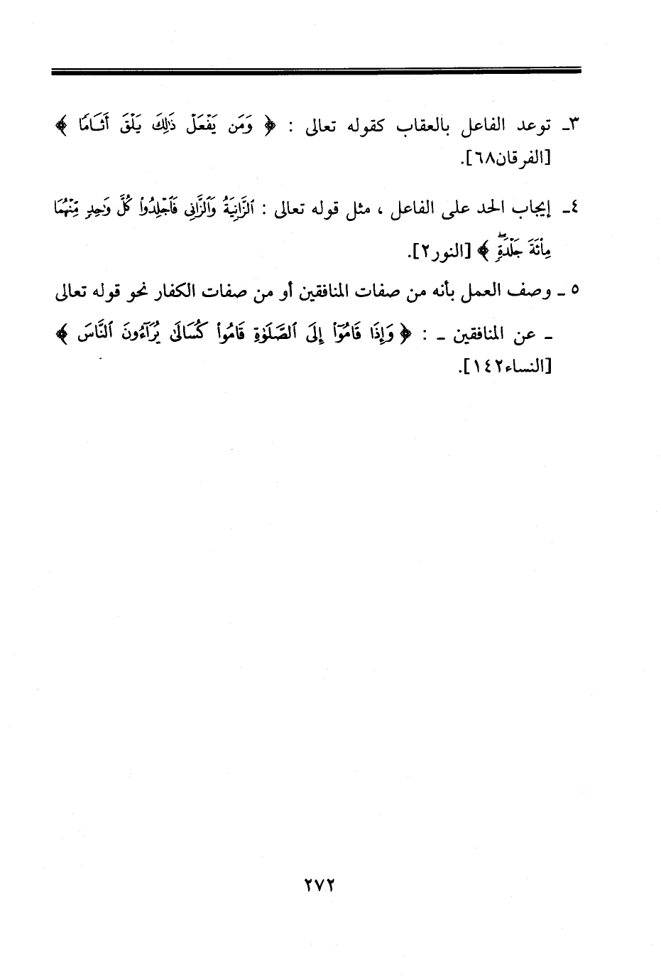 ٥ - وصف العمل بأنه من صفات المنافقين أو من صفات الكفار نحو قوله تعالى ـ عن المنافقين ـ: {وَإِذَا قَامُوا إِلَى الصَّلَاةِ قَامُوا كُسَالَى} [النساء١٤٢].