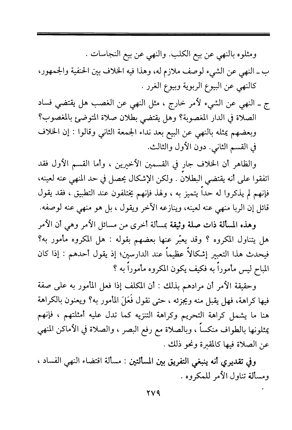 والظاهر أن الخلاف جارٍ في القسمين الأخيرين، وأما القسم الأول فقد اتفقوا على أنه يقتضي البطلان. ولكن الإشكال يحصل في حد المنهي عنه لعينه، فإنهم لم يذكروا له حداً يتميز به، ولهذ فإنهم يختلفون عند التطبيق، فقد يقول قائل إن الربا منهي عنه لعينه، وينازعه الآخر ويقول، بل هو منهي عنه لوصفه.