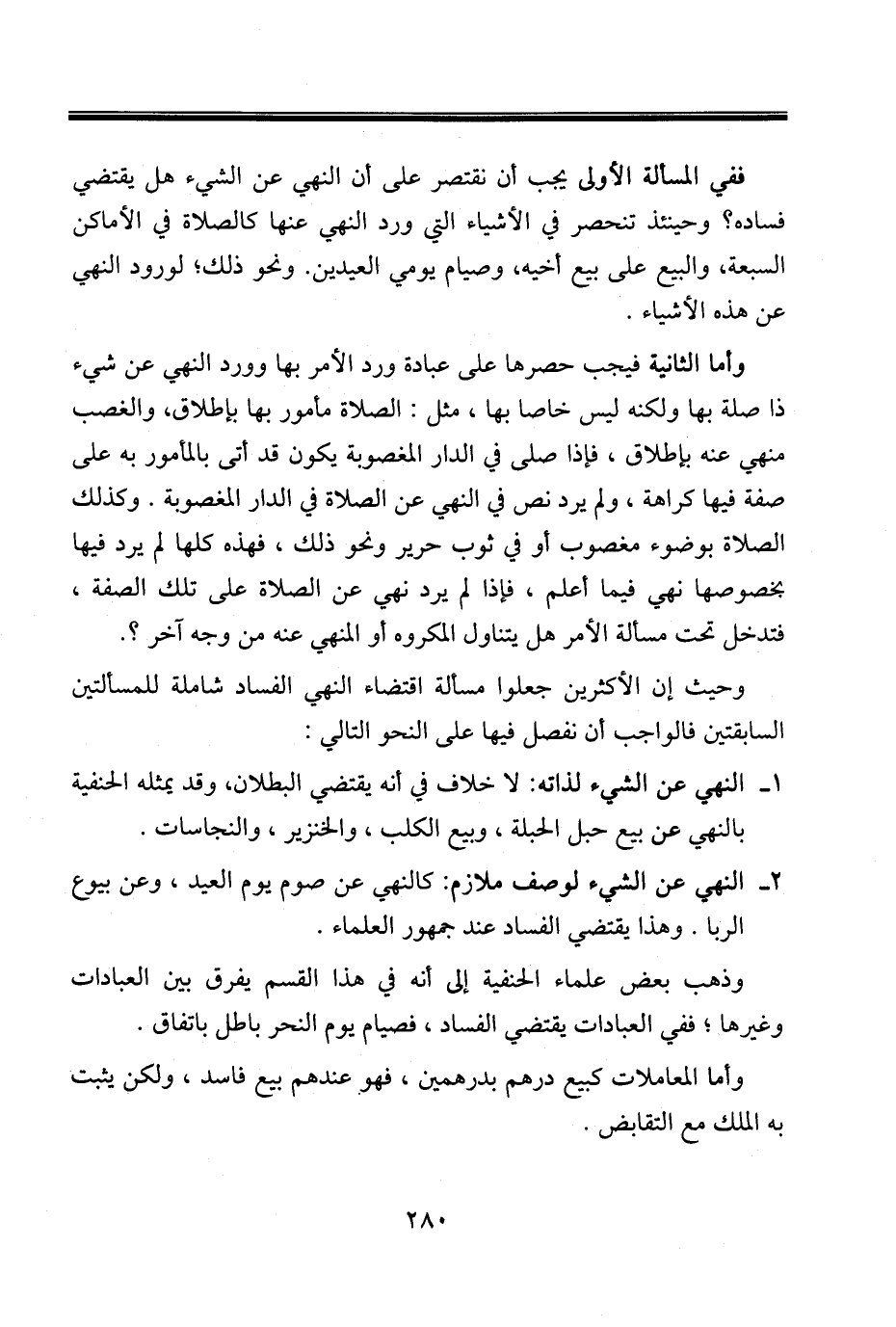 ففي المسألة الأولى يجب أن نقتصر على أن النهي عن الشيء هل يقتضي فساده؟ وحينئذ تنحصر في الأشياء التي ورد النهي عنها كالصلاة في الأماكن السبعة، والبيع على بيع أخيه، وصيام يومي العيدين. ونحو ذلك؛ لورود النهي عن هذه الأشياء.