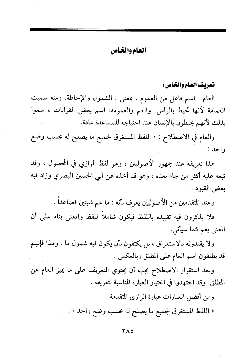 وبعد استقرار الاصطلاح يجب أن يحتوي التعريف على ما يميز العام عن المطلق. وقد اجتهدوا في اختيار العبارة المناسبة لتعريفه.