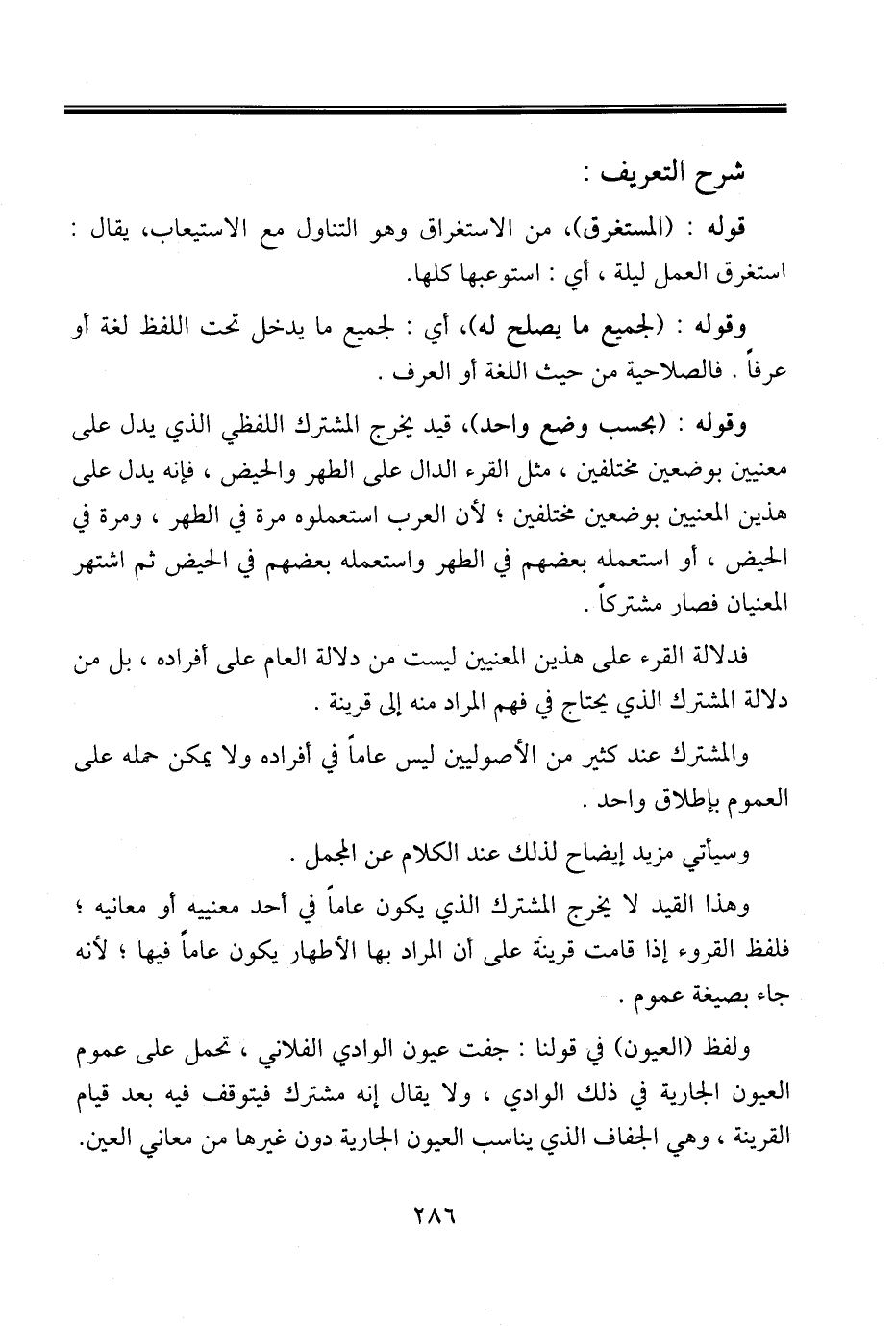 ولفظ (العيون) في قولنا: جفت عيون الوادي الفلاني، تحمل على عموم العيون الجارية في ذلك الوادي، ولا يقال إنه مشترك فيتوقف فيه بعد قيام القرينة، وهي الجفاف الذي يناسب العيون الجارية دون غيرها من معاني العين.