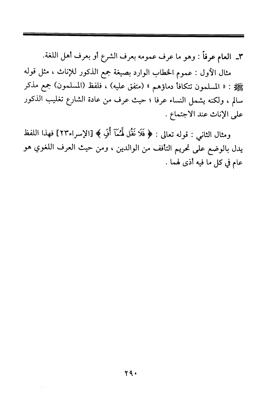 ومثال الثاني: قوله تعالى: {فَلَا تَقُلْ لَهُمَا أُفٍّ} [الإسراء٢٣] فهذا اللفظ يدل بالوضع على تحريم التأفف من الوالدين، ومن حيث العرف اللغوي هو عام في كل ما فيه أذى لهما.