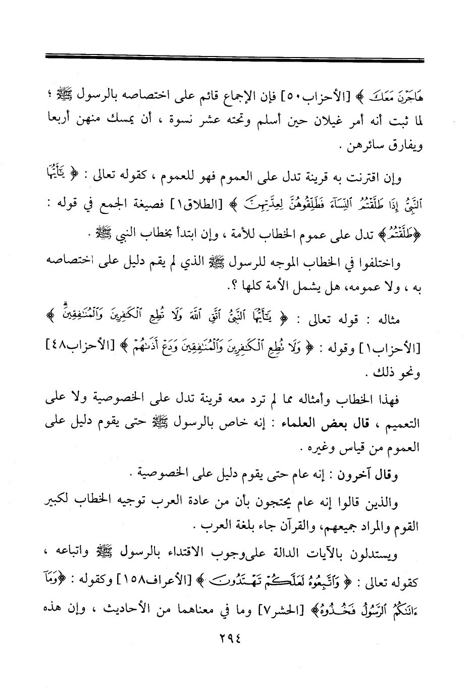 فهذا الخطاب وأمثاله مما لم ترد معه قرينة تدل على الخصوصية ولا على التعميم، قال بعض العلماء: إنه خاص بالرسول صلى الله عليه وسلم حتى يقوم دليل على العموم من قياس وغيره.