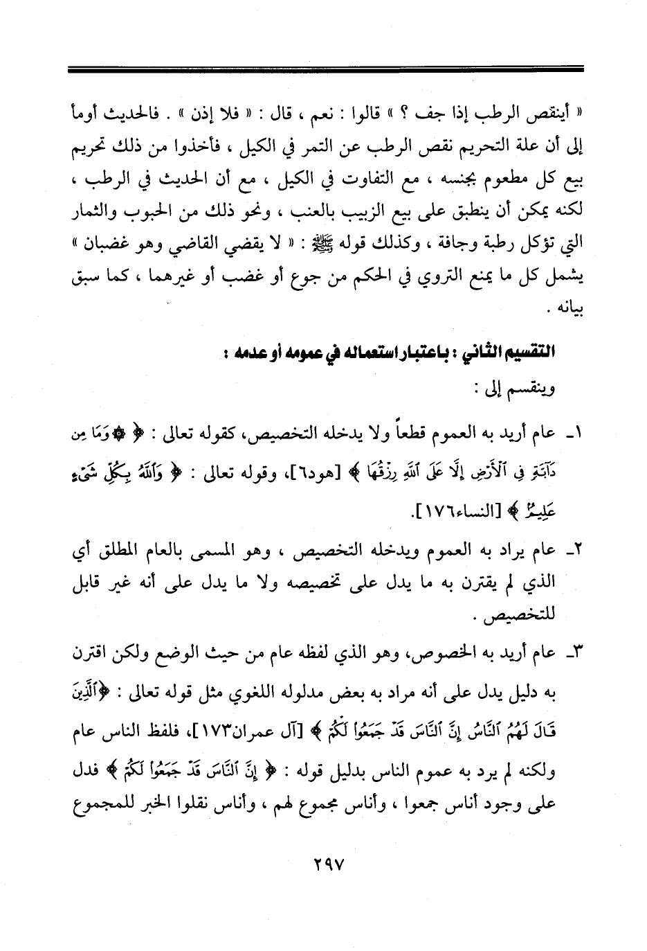 «أينقص الرطب إذا جف؟» قالوا: نعم، قال: «فلا إذن». فالحديث أومأ إلى أن علة التحريم نقص الرطب عن التمر في الكيل، فأخذوا من ذلك تحريم بيع كل مطعوم بجنسه، مع التفاوت في الكيل، مع أن الحديث في الرطب، لكنه يمكن أن ينطبق على بيع الزبيب بالعنب، ونحو ذلك من الحبوب والثمار التي تؤكل رطبة وجافة، وكذلك قوله صلى الله عليه وسلم: «لا يقضي القاضي وهو غضبان» يشمل كل ما يمنع التروي في الحكم من جوع أو غضب أو غيرهما، كما سبق بيانه.