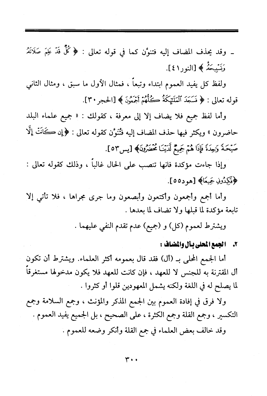 أما الجمع المحلى بـ (أل) فقد قال بعمومه أكثر العلماء. ويشترط أن تكون أل المقترنة به للجنس لا للعهد، فإن كانت للعهد فلا يكون مدخولها مستغرقاً لما يصلح له في اللغة ولكنه يشمل المعهودين قلوا أو كثروا.