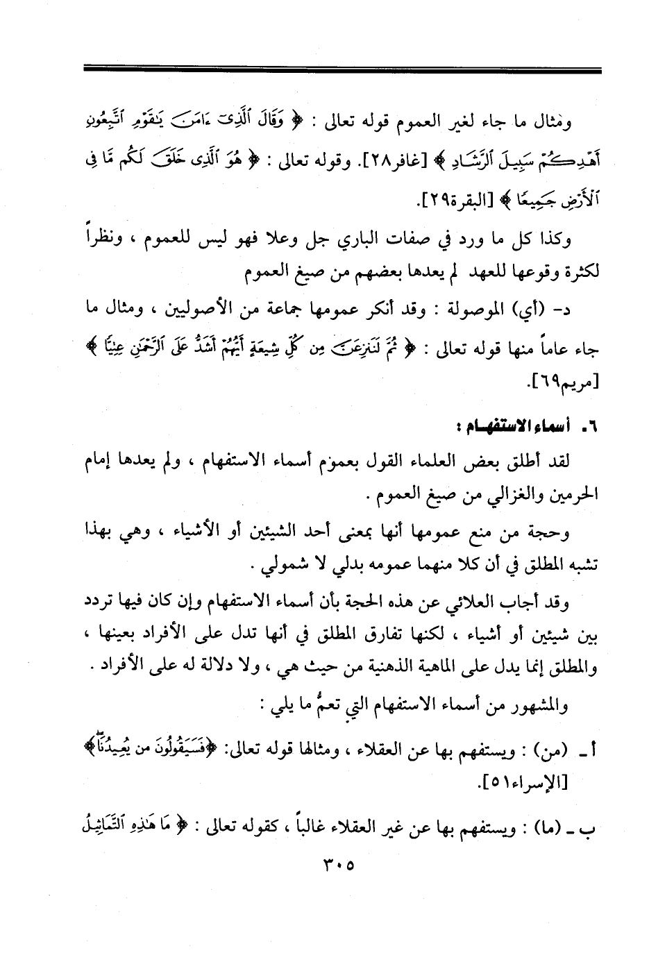 د- (أي) الموصولة: وقد أنكر عمومها جماعة من الأصوليين، ومثال ما جاء عاماً منها قوله تعالى: {ثُمَّ لَنَنْزِعَنَّ مِنْ كُلِّ شِيعَةٍ أَيُّهُمْ أَشَدُّ عَلَى الرَّحْمَنِ عِتِيًّا} [مريم٦٩].