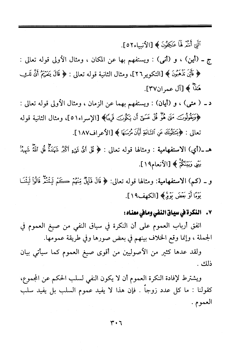 ويشترط لإفادة النكرة العموم أن لا يكون النفي لسلب الحكم عن المجموع، كقولنا: ما كل عدد زوجاً. فإن هذا لا يفيد عموم السلب بل يفيد سلب العموم.