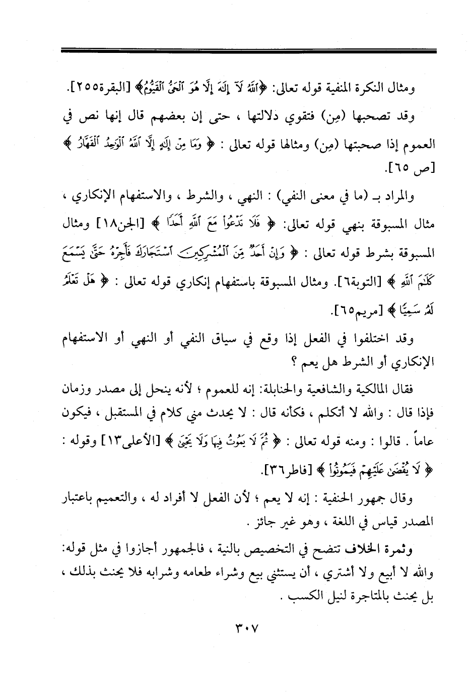 ومثال النكرة المنفية قوله تعالى: {اللَّهُ لَا إِلَهَ إِلَّا هُوَ الْحَيُّ الْقَيُّومُ} [البقرة٢٥٥].