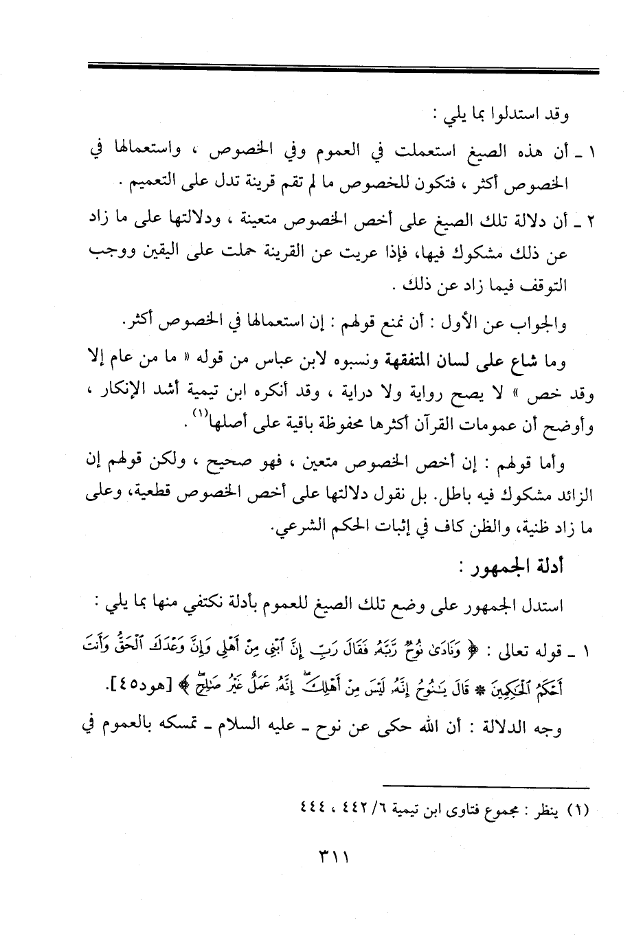 وما شاع على لسان المتفقهة ونسبوه لابن عباس من قوله «ما من عام إلا وقد خص» لا يصح رواية ولا دراية، وقد أنكره ابن تيمية أشد الإنكار، وأوضح أن عمومات القرآن أكثرها محفوظة باقية على أصلها (١).