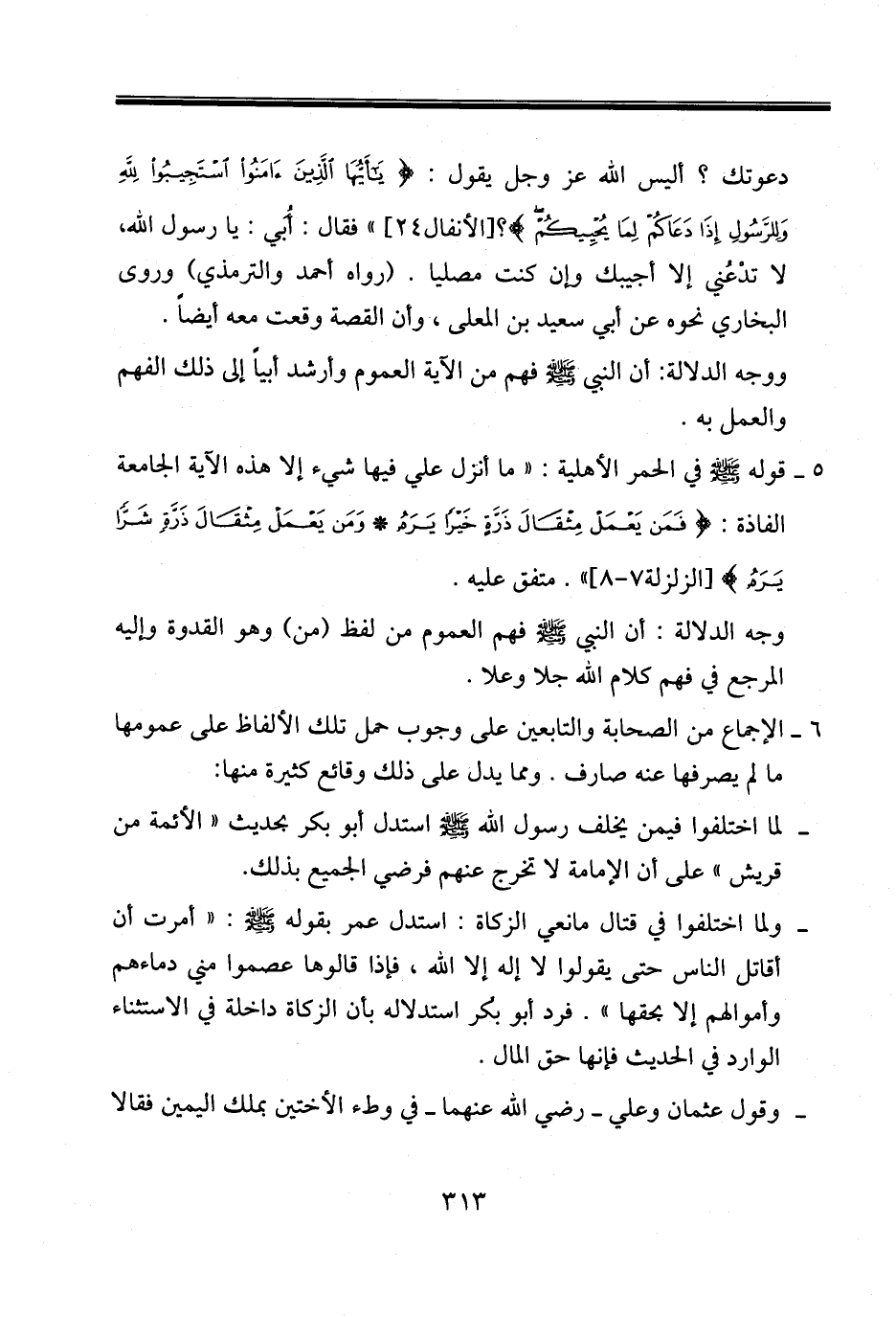 ـ ... ولما اختلفوا في قتال مانعي الزكاة: استدل عمر بقوله صلى الله عليه وسلم: «أمرت أن أقاتل الناس حتى يقولوا لا إله إلا الله، فإذا قالوها عصموا مني دماءهم وأموالهم إلا بحقها». فرد أبو بكر استدلاله بأن الزكاة داخلة في الاستثناء الوارد في الحديث فإنها حق المال.