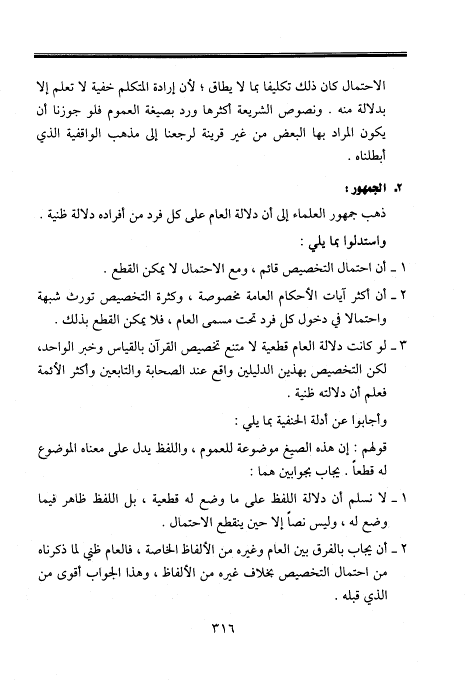 الاحتمال كان ذلك تكليفا بما لا يطاق؛ لأن إرادة المتكلم خفية لا تعلم إلا بدلالة منه. ونصوص الشريعة أكثرها ورد بصيغة العموم فلو جوزنا أن يكون المراد بها البعض من غير قرينة لرجعنا إلى مذهب الواقفية الذي أبطلناه.