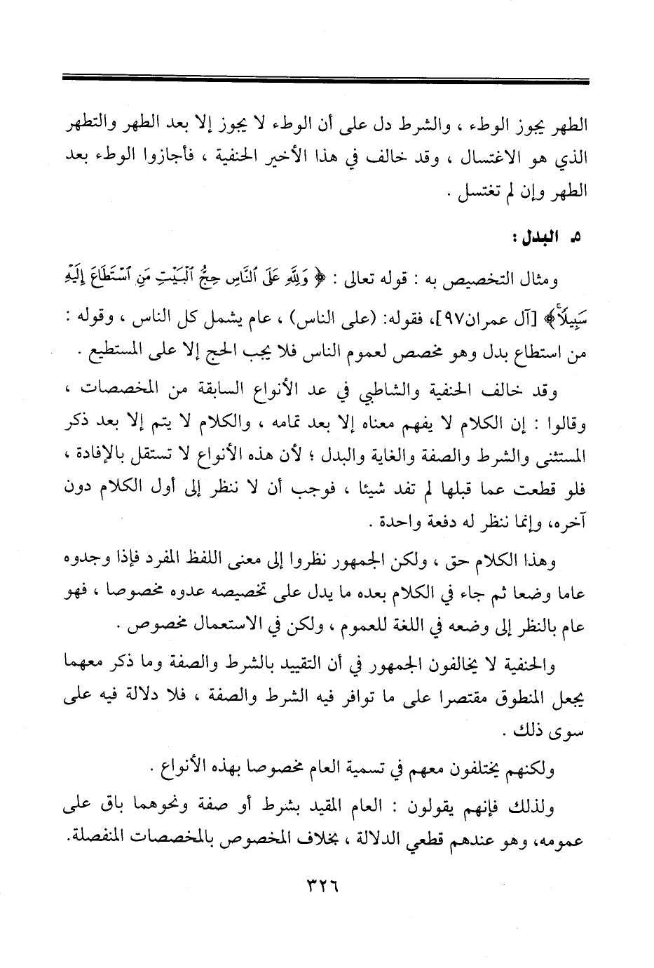 ومثال التخصيص به: قوله تعالى: {وَلِلَّهِ عَلَى النَّاسِ حِجُّ الْبَيْتِ مَنِ اسْتَطَاعَ إِلَيْهِ سَبِيلًا} [آل عمران٩٧]، فقوله: (على الناس)، عام يشمل كل الناس، وقوله: من استطاع بدل وهو مخصص لعموم الناس فلا يجب الحج إلا على المستطيع.