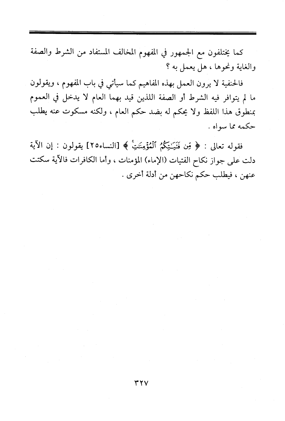 فالحنفية لا يرون العمل بهذه المفاهيم كما سيأتي في باب المفهوم، ويقولون ما لم يتوافر فيه الشرط أو الصفة اللذين قيد بهما العام لا يدخل في العموم بمنطوق هذا اللفظ ولا يحكم له بضد حكم العام، ولكنه مسكوت عنه يطلب حكمه مما سواه.