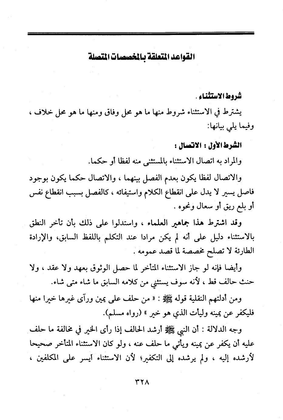 يشترط في الاستثناء شروط منها ما هو محل وفاق ومنها ما هو محل خلاف، وفيما يلي بيانها: