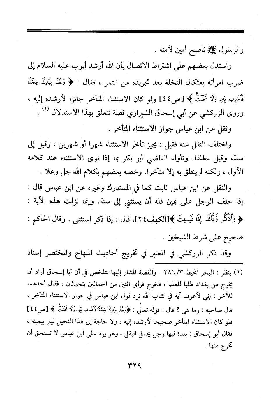 (١) ينظر: البحر المحيط ٣/ ٢٨٦. والقصة المشار إليها تتلخص في أن أبا إسحاق أراد أن يخرج من بغداد طلبا للعلم، فخرج فرأى اثنين من الحمالين يتحدثان، فقال أحدهما للآخر: إني لأعرف آية في كتاب الله ترد قول ابن عباس في جواز الاستثناء المتأخر، قال صاحبه: وما هي؟ قال: قوله تعالى: {وَخُذْ بِيَدِكَ ضِغْثًا فَاضْرِبْ بِهِ وَلَا تَحْنَثْ} [ص٤٤] فلو كان الاستثناء المتأخر صحيحا لأرشده إليه، ولا حاجة إلى هذا التحيل ليبر بيمينه، فقال أبو إسحاق: بلدة فيها رجل يحمل البقل، وهو يرد على ابن عباس لا تستحق أن تخرج منها.