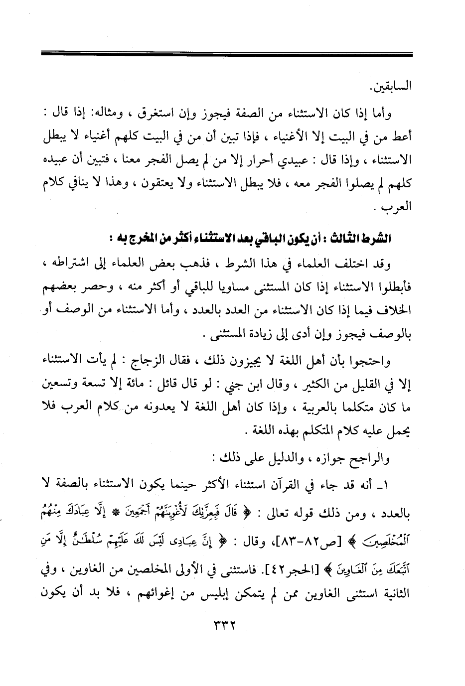 ١ـ أنه قد جاء في القرآن استثناء الأكثر حينما يكون الاستثناء بالصفة لا بالعدد، ومن ذلك قوله تعالى: {قَالَ فَبِعِزَّتِكَ لَأُغْوِيَنَّهُمْ أَجْمَعِينَ (٨٢) إِلَّا عِبَادَكَ مِنْهُمُ الْمُخْلَصِينَ} [ص٨٢ - ٨٣]، وقال: {إِنَّ عِبَادِي لَيْسَ لَكَ عَلَيْهِمْ سُلْطَانٌ إِلَّا مَنِ اتَّبَعَكَ مِنَ الْغَاوِينَ} [الحجر٤٢]. فاستثنى في الأولى المخلصين من الغاوين، وفي الثانية استثنى الغاوين ممن لم يتمكن إبليس من إغوائهم، فلا بد أن يكون