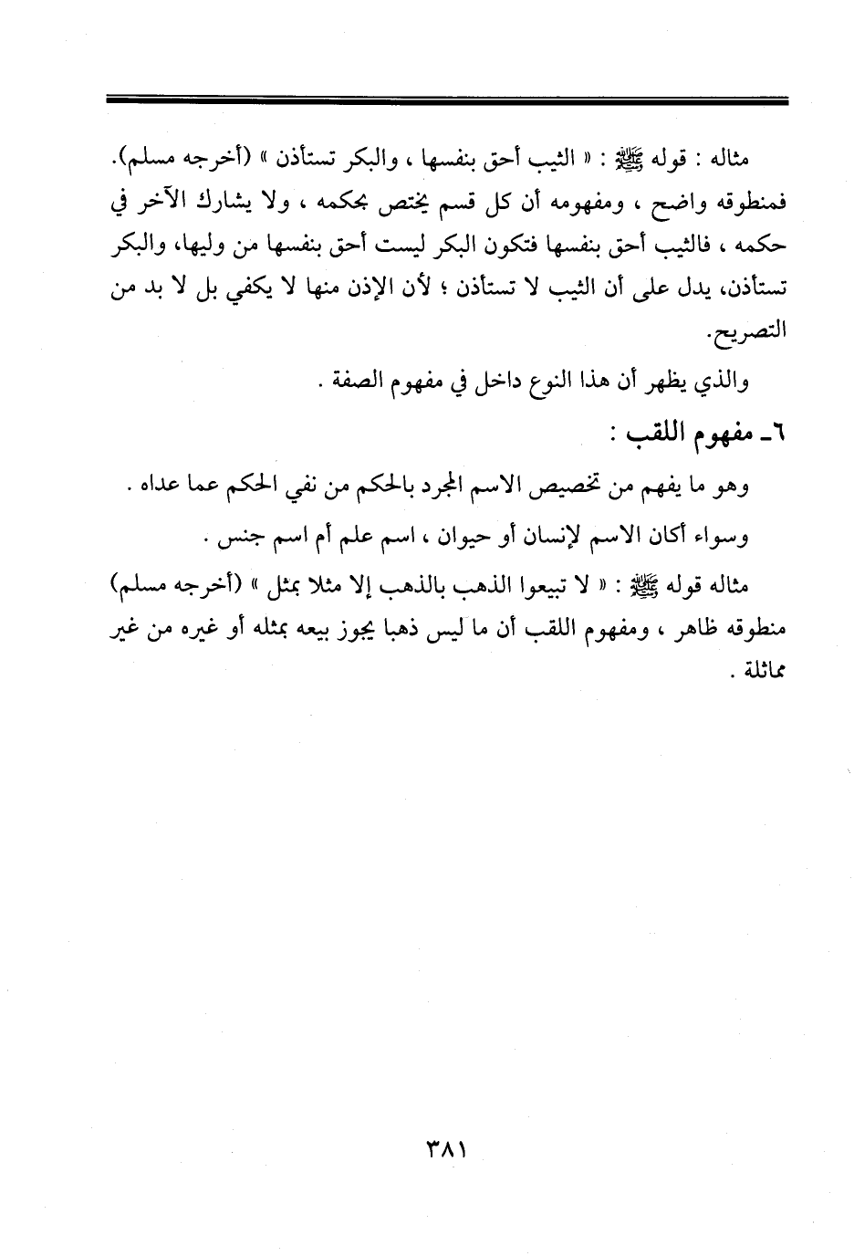 مثاله قوله صلى الله عليه وسلم: «لا تبيعوا الذهب بالذهب إلا مثلا بمثل» (أخرجه مسلم) منطوقه ظاهر، ومفهوم اللقب أن ما ليس ذهبا يجوز بيعه بمثله أو غيره من غير مماثلة.