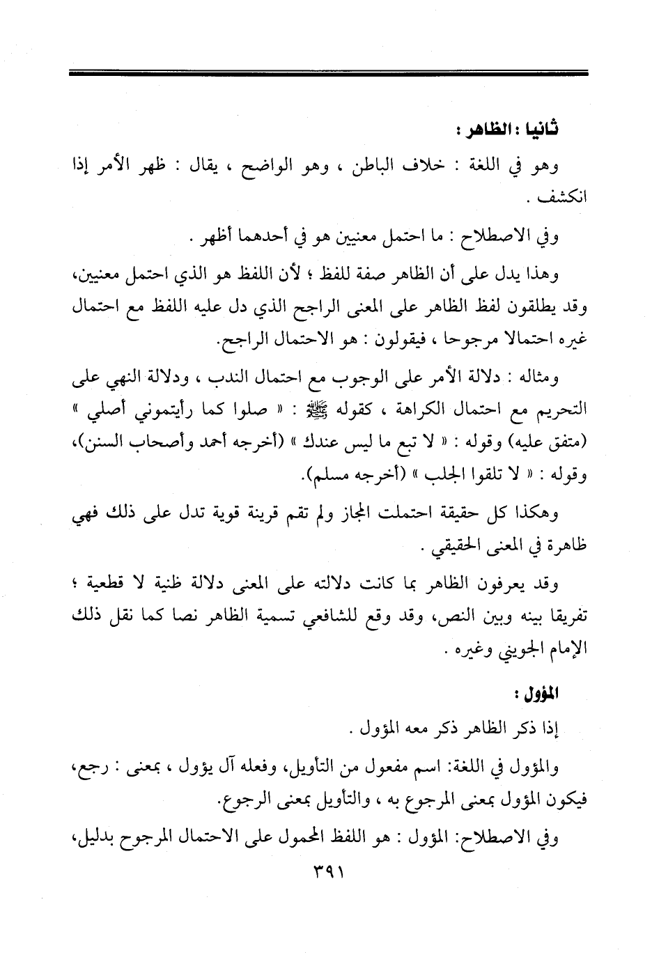 ومثاله: دلالة الأمر على الوجوب مع احتمال الندب، ودلالة النهي على التحريم مع احتمال الكراهة، كقوله صلى الله عليه وسلم: «صلوا كما رأيتموني أصلي» (متفق عليه) وقوله: «لا تبع ما ليس عندك» (أخرجه أحمد وأصحاب السنن)، وقوله: «لا تلقوا الجلب» (أخرجه مسلم).