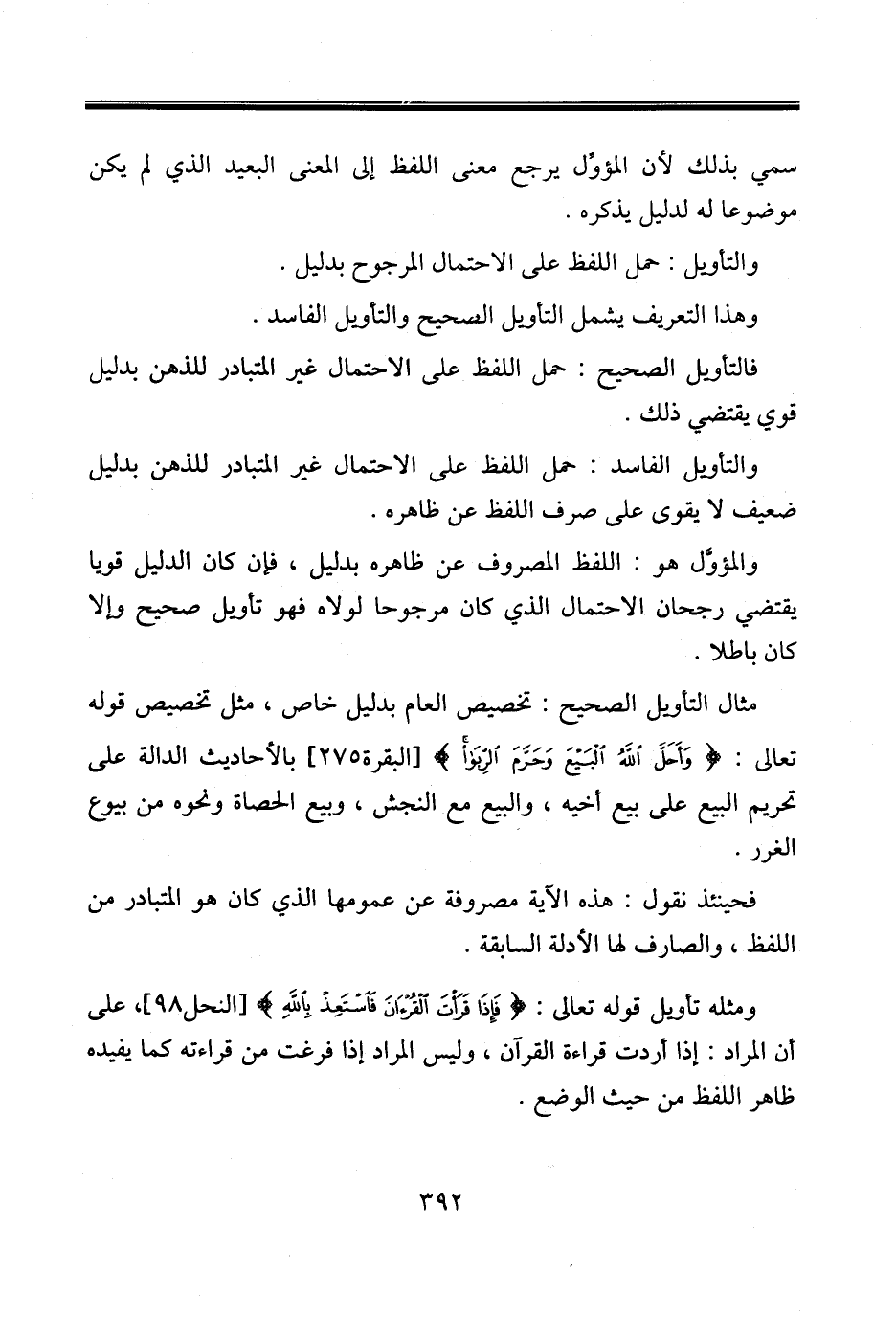 ومثله تأويل قوله تعالى: {فَإِذَا قَرَأْتَ الْقُرْآنَ فَاسْتَعِذْ بِاللَّهِ} [النحل٩٨]، على أن المراد: إذا أردت قراءة القرآن، وليس المراد إذا فرغت من قراءته كما يفيده ظاهر اللفظ من حيث الوضع.
