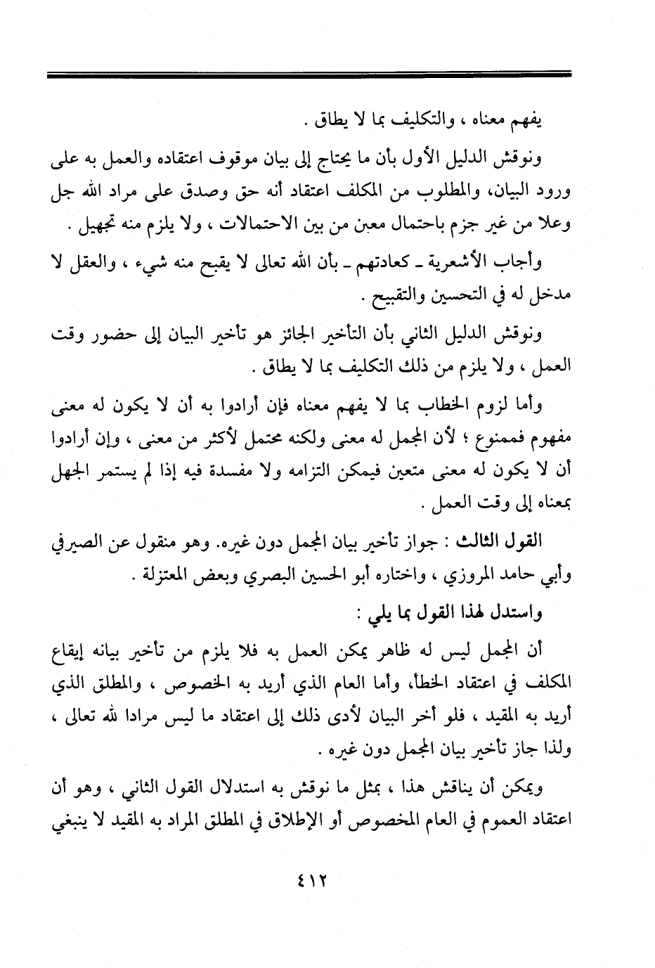 القول الثالث: جواز تأخير بيان المجمل دون غيره. وهو منقول عن الصيرفي وأبي حامد المروزي، واختاره أبو الحسين البصري وبعض المعتزلة.