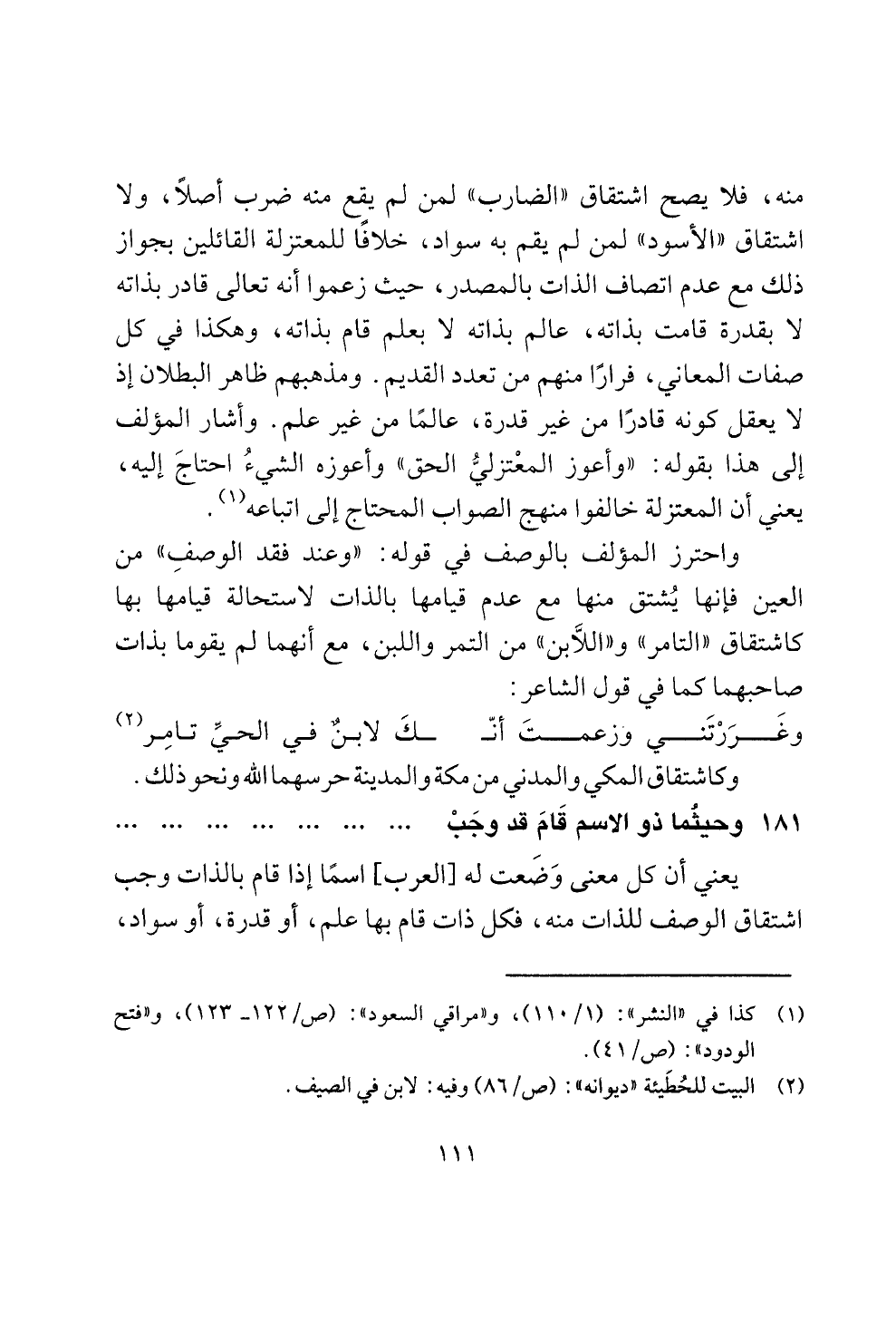 اشتقاق الوصف للذات منه، فكل ذات قام بها علم، أو قدرة، أو سواد،