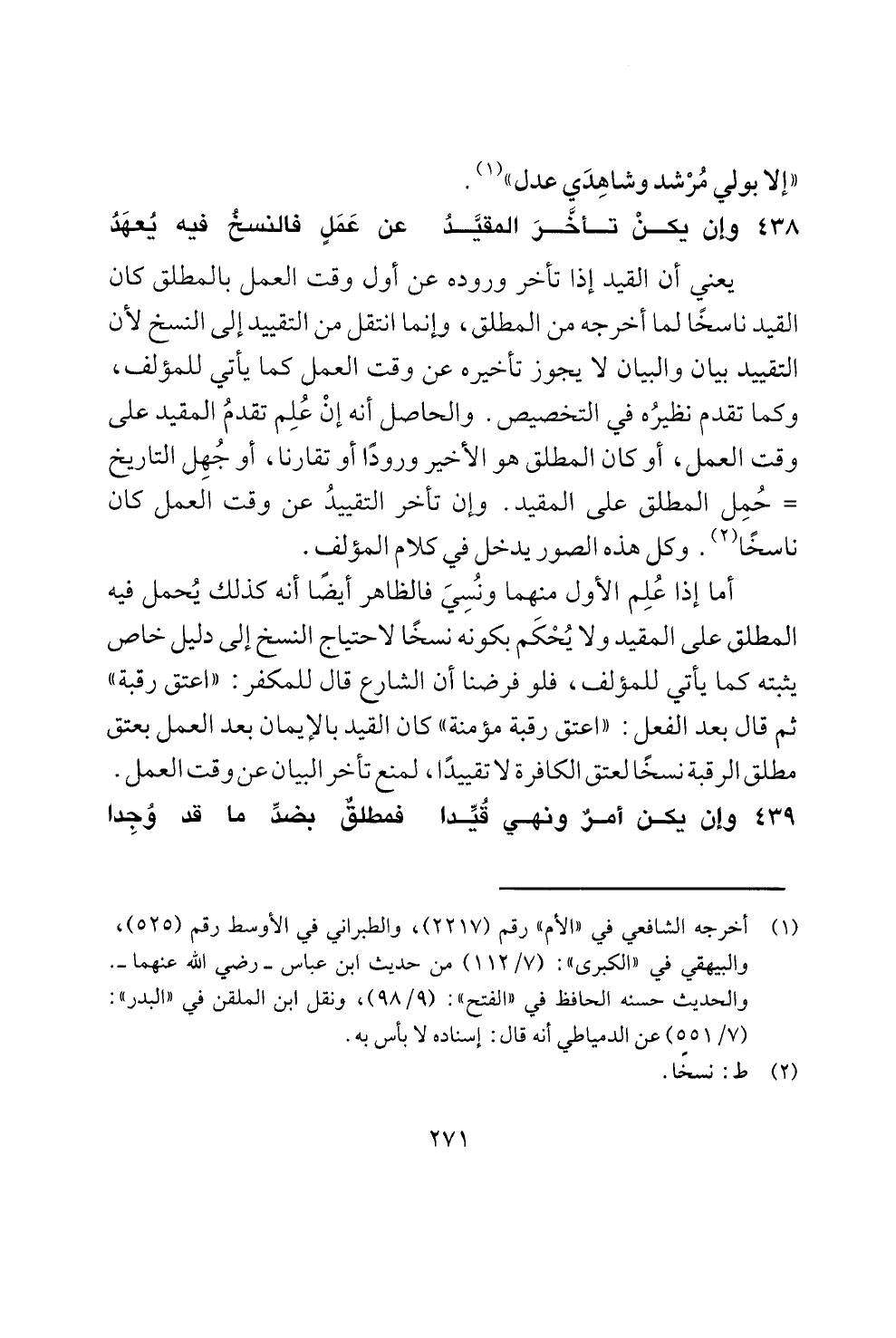 439 وان يكن أمر ونهي قيدا فمطلق بضذ ما قد وجدا
