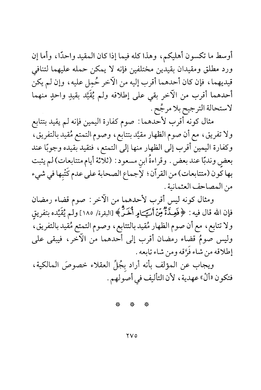 مثال كونه أقرب لاحدهما: صوم كفارة اليمين فانه لم يقيد بتتابع