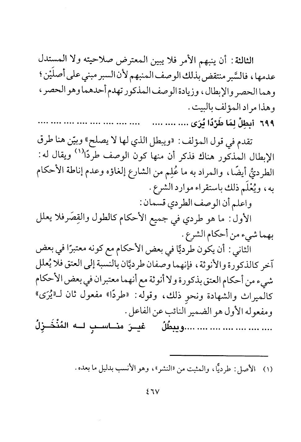 الابطال المذكور هناك فذكر ان منها كون الوصف طردا (1) ويقال له:
