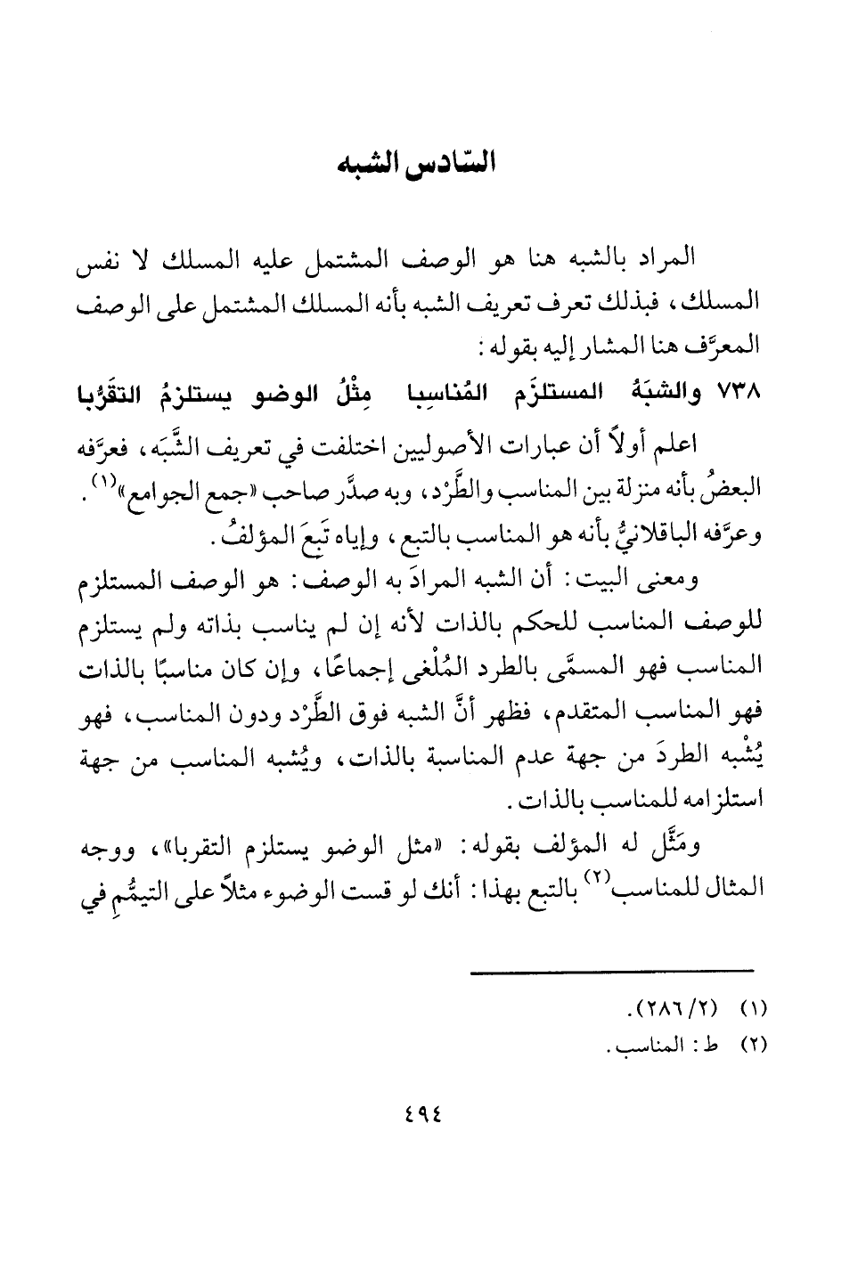 738 والشبه المستلزم الفناسبا مثل الوضو يستلزم التقربا