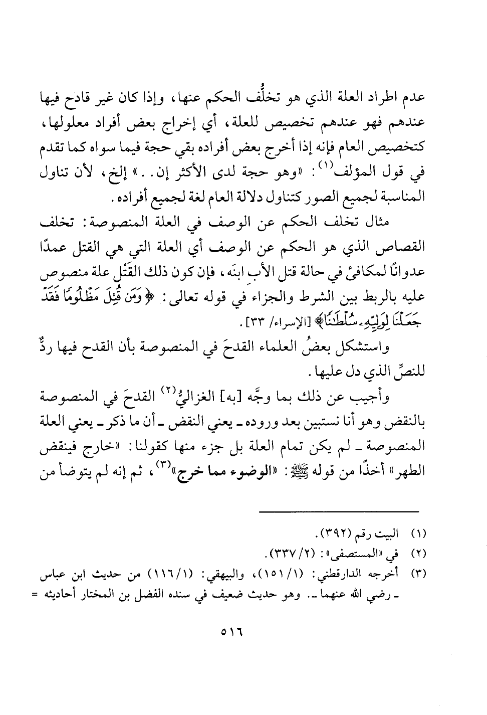 مثال تخلف الحكم عن الوصف في العلة المنصوصة: تخلف