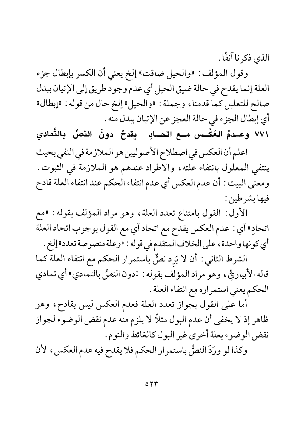 ومعنى البيت: أن عدم العكس أي عدم انتفاء الحكم عند انتفاء العلة قادح