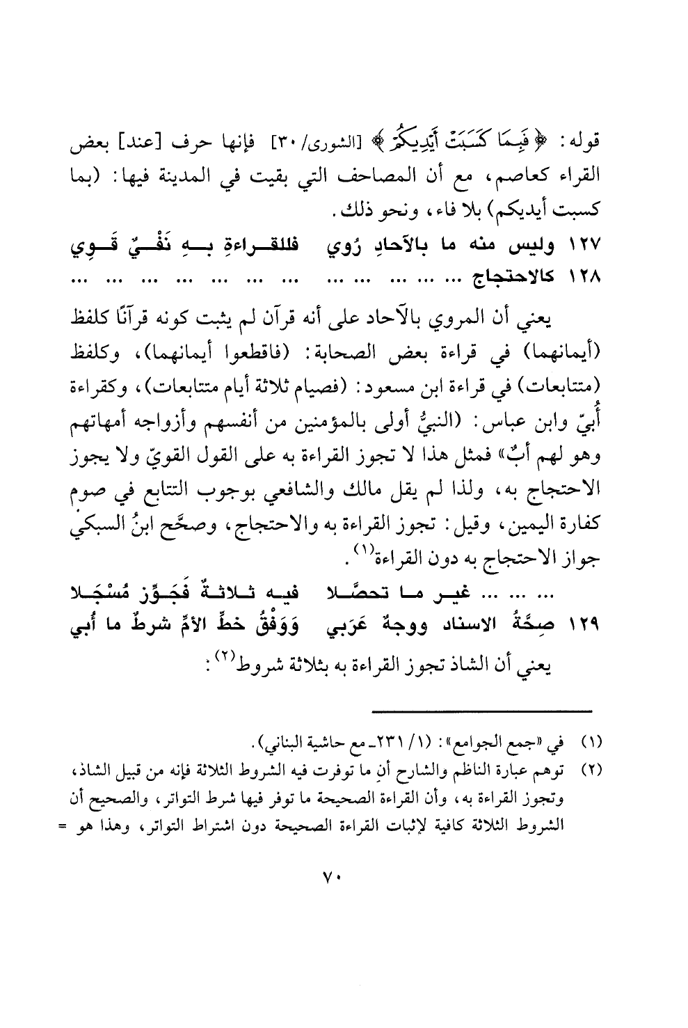 يعني ان الشاذ تجوز القراءة به بثلاثة شروط (2):