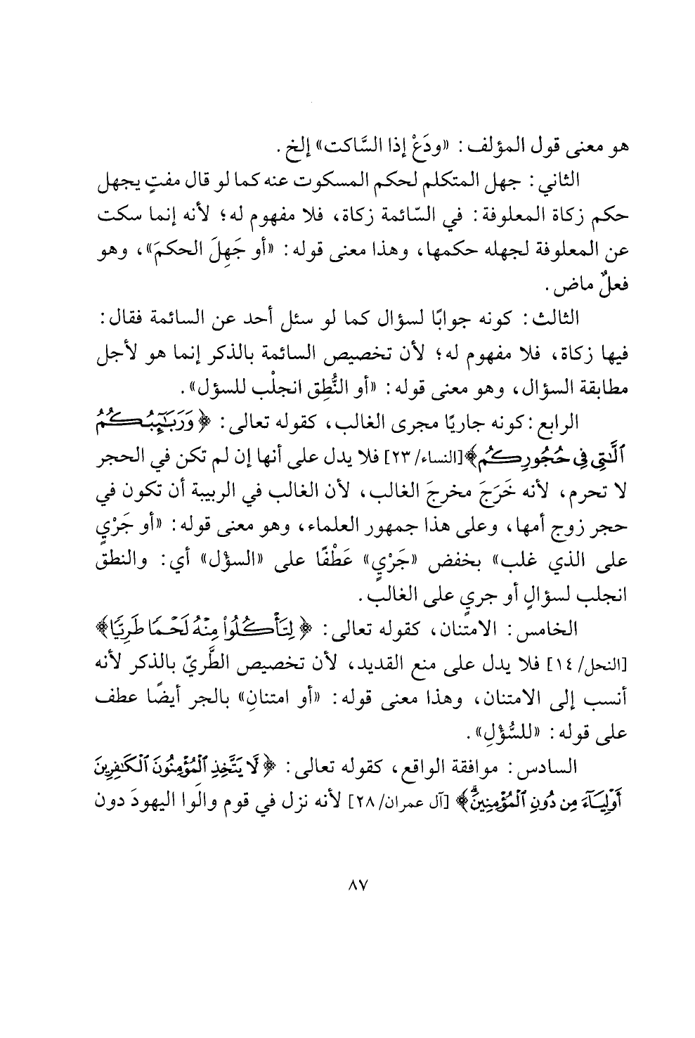 السادس: موافقة الواقع، كقوله تعالى: < لا يتخذ لمومنون البهفرين