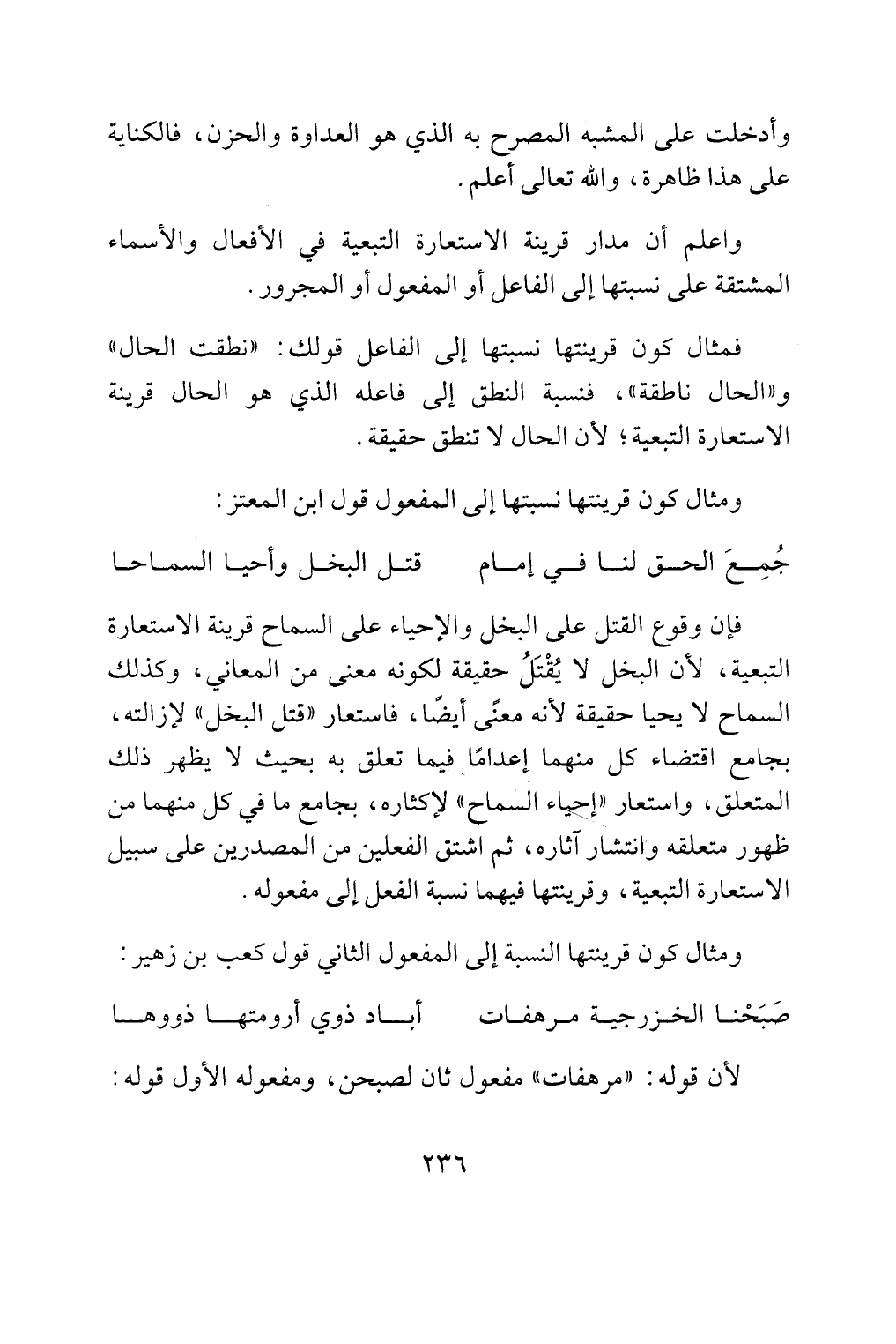 واعلم أن مدار قرينة الاستعارة التبعية في الأفعال والأسماء