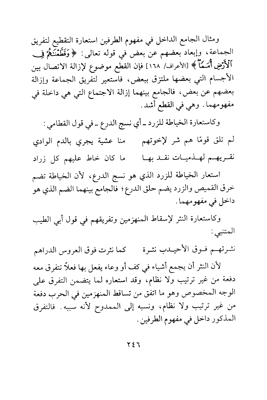 وكاستعارة النثر لإسقاط المنهزمين وتفريقهم في قول أبي الطيب