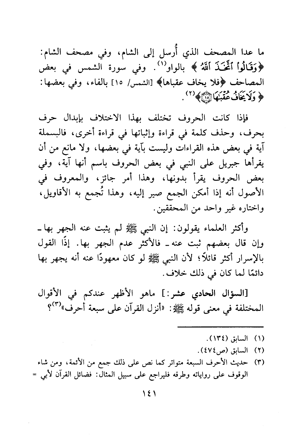 بحرف، وحذف كلمة في قراءة وإثباتها في قراءة أخرى، فالبسملة
